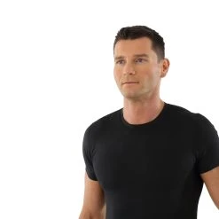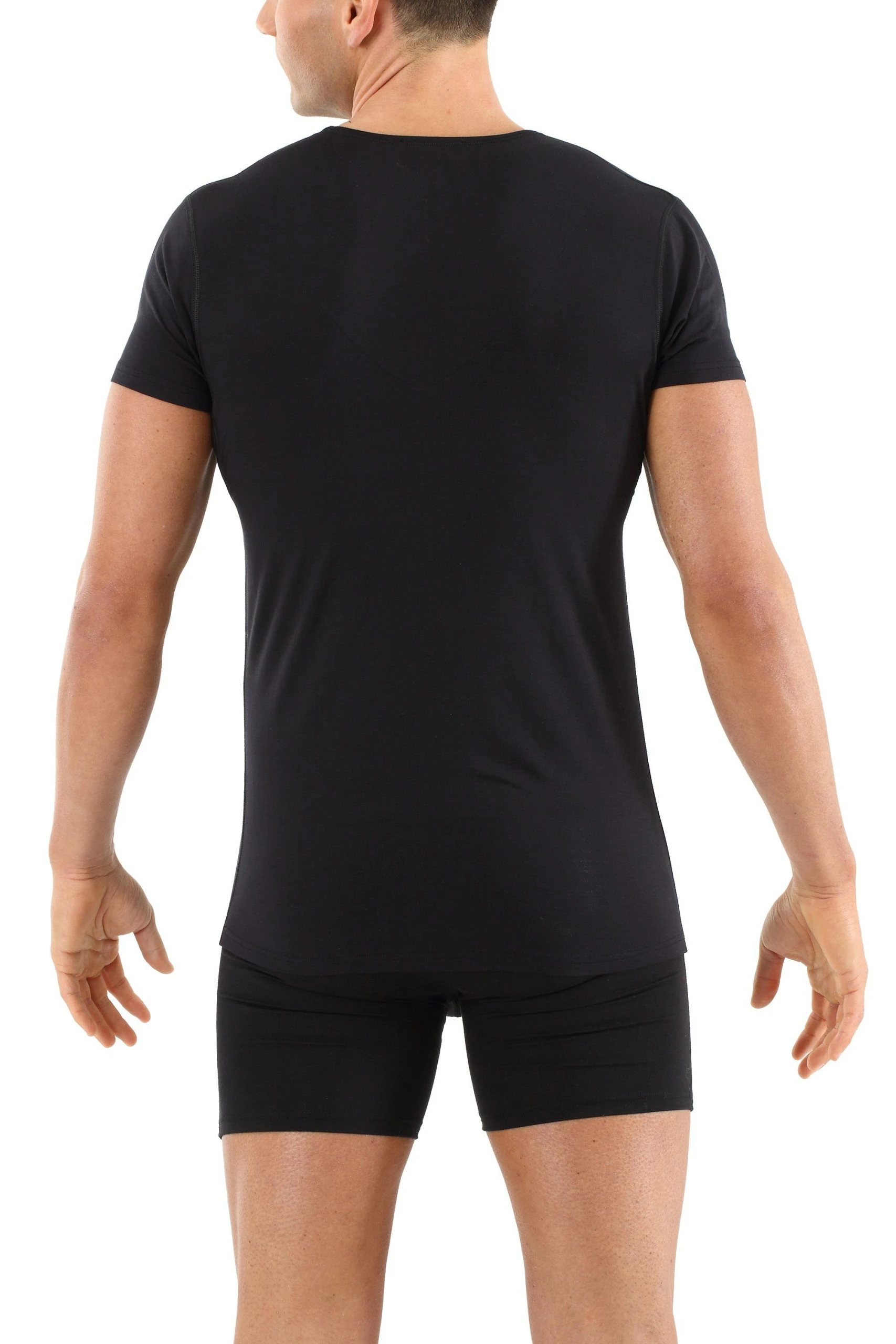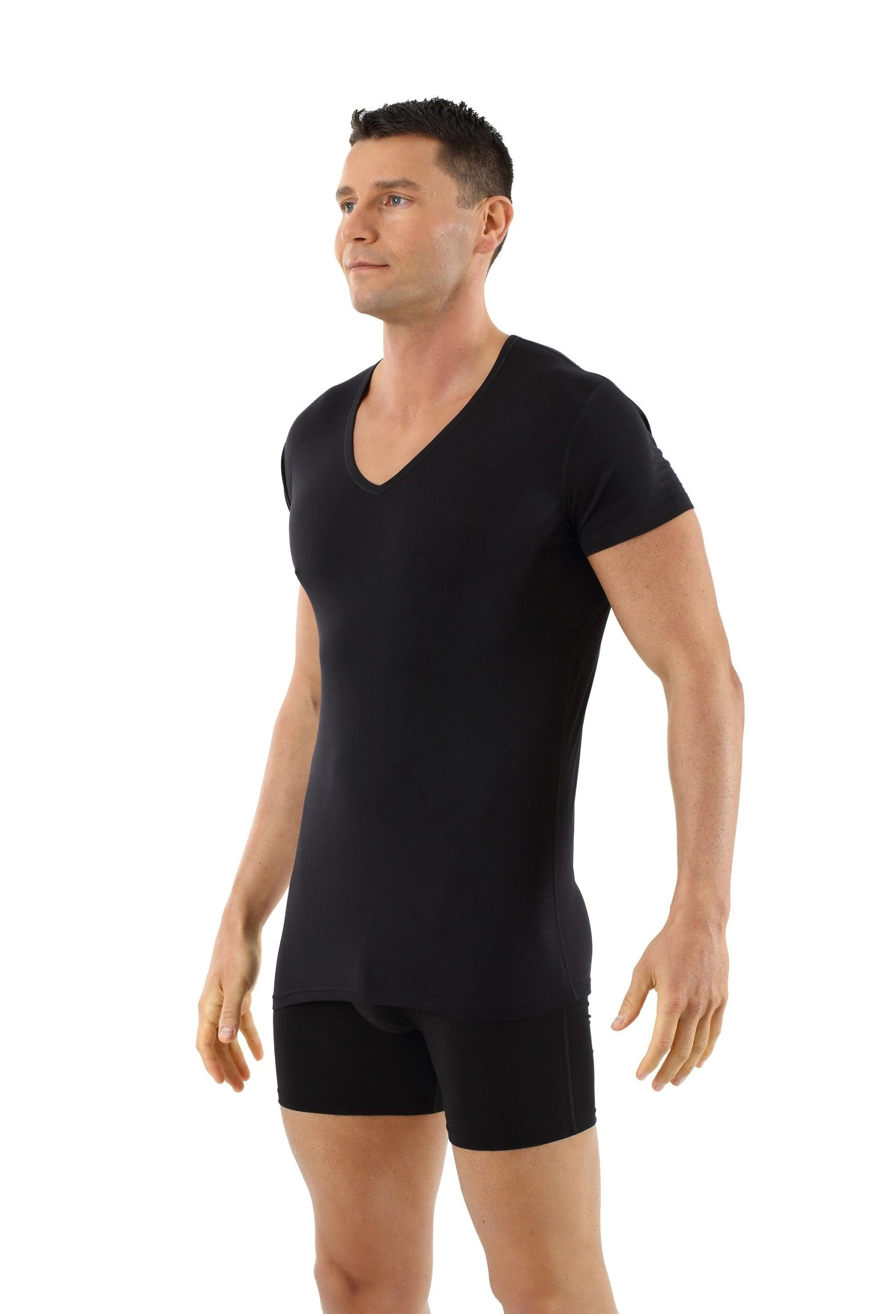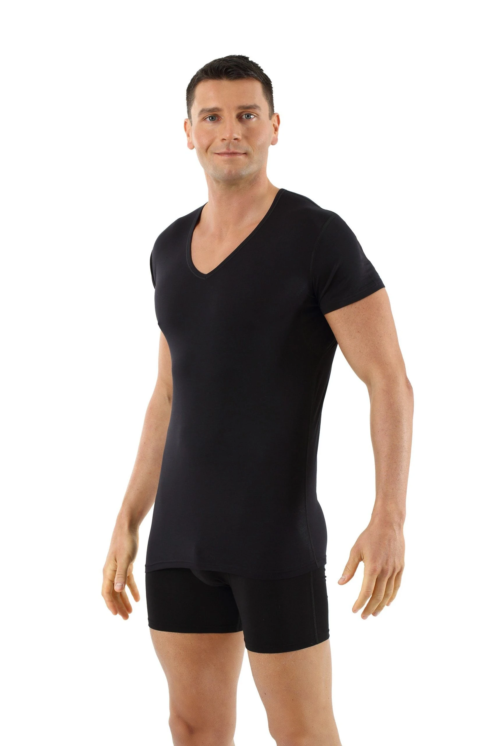 ALBERT KREUZ Kurzarm-Herrenunterhemd aus 100% Merino Wolle Mulesing-frei mit extra tiefem Deep-V Ausschnitt in Schwarz
