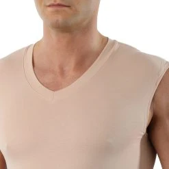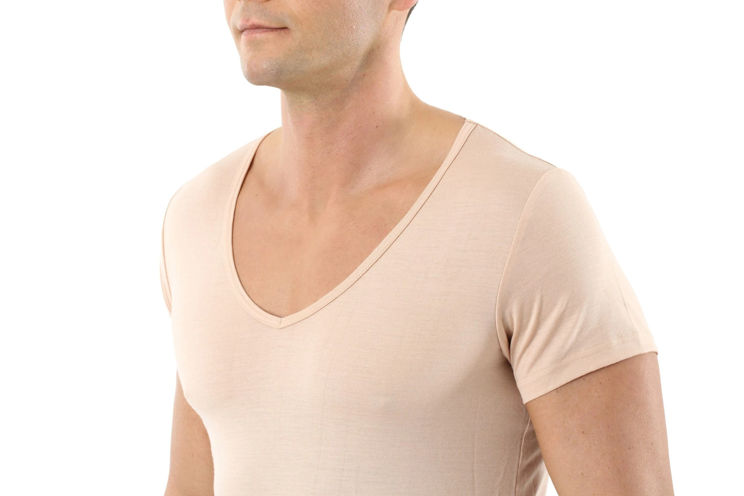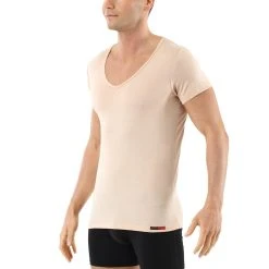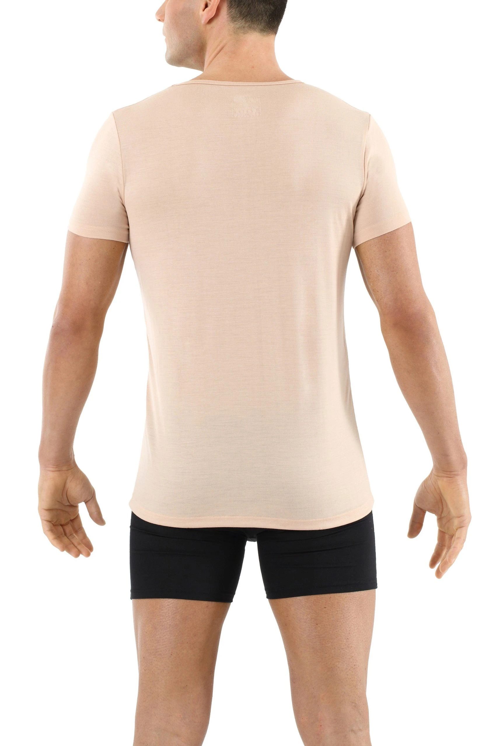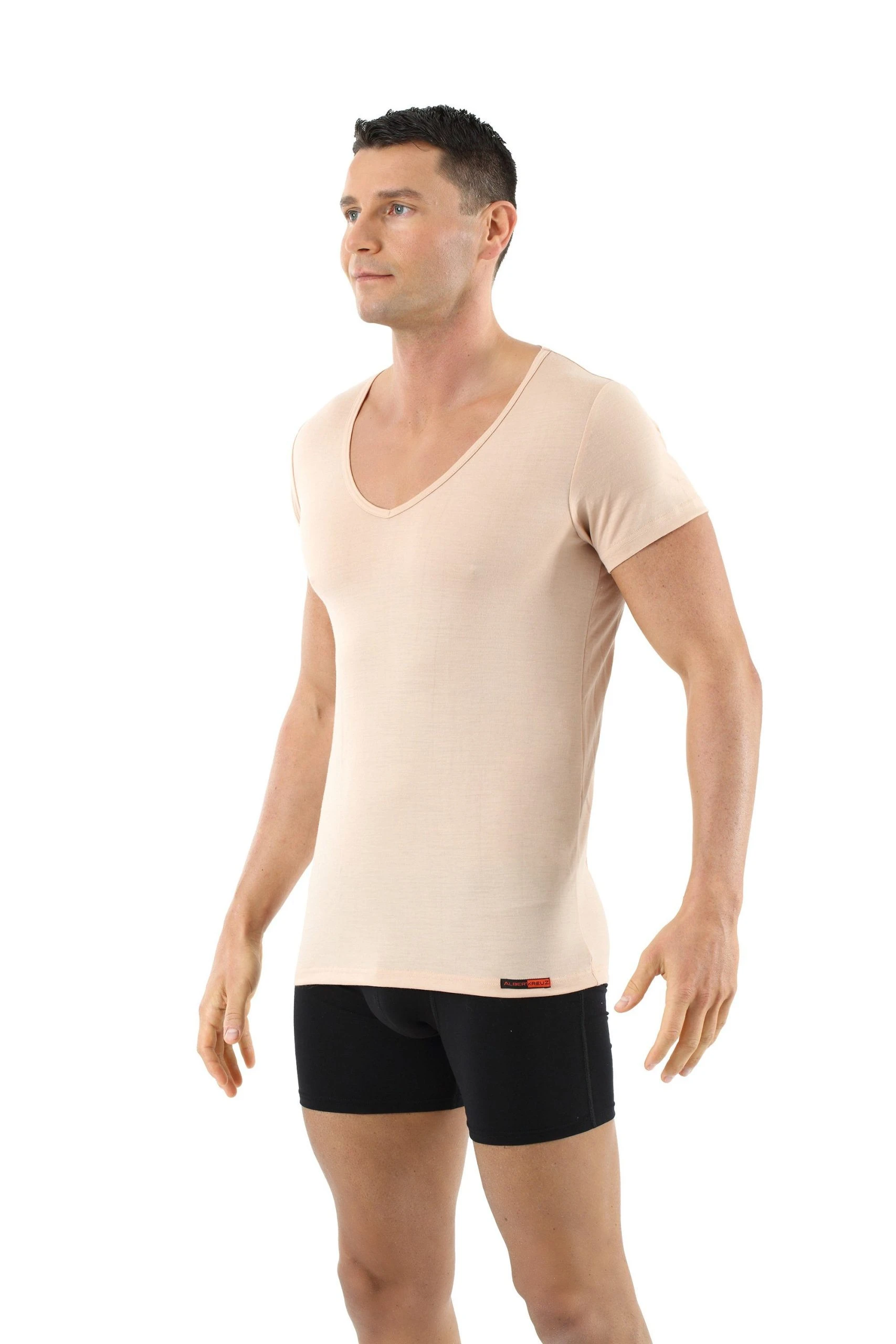 ALBERT KREUZ Unsichtbares Kurzarm-Herrenunterhemd Deep-V aus 100% Merino Wolle Mulesing-frei in Beige