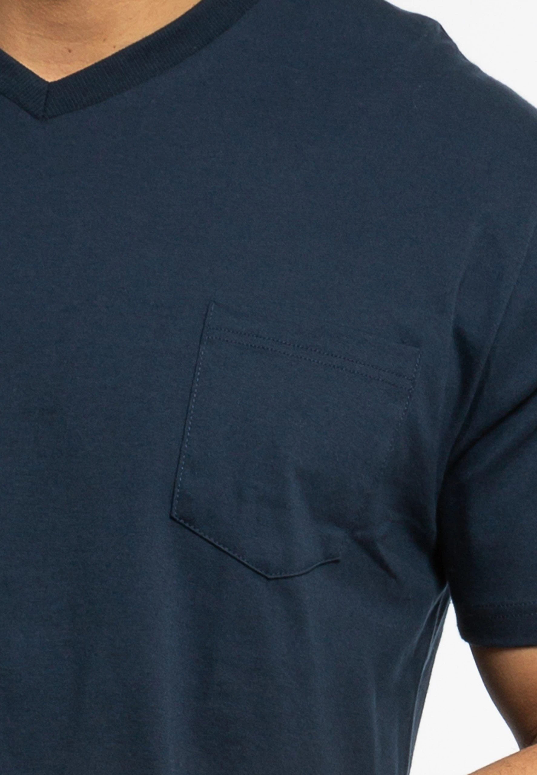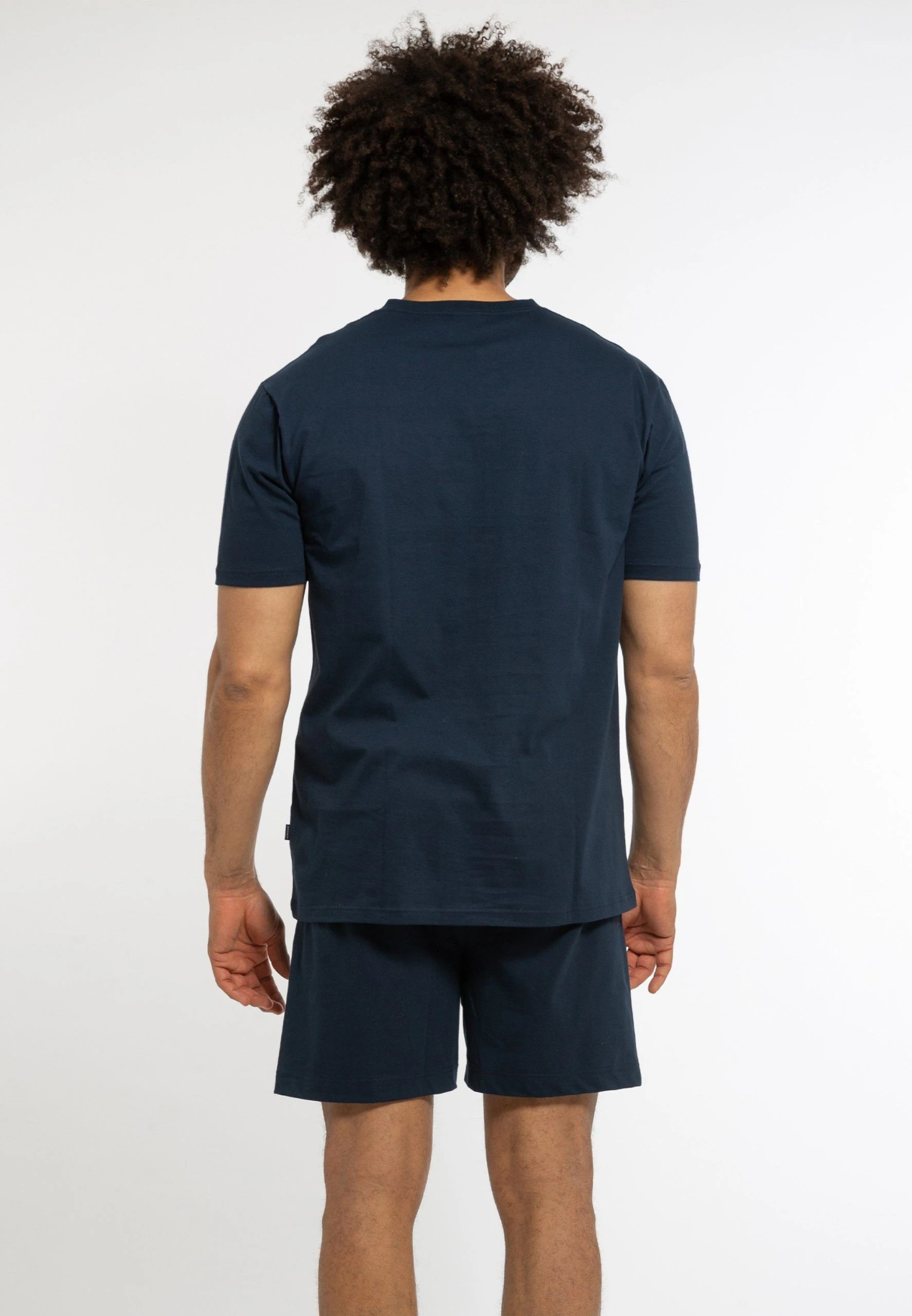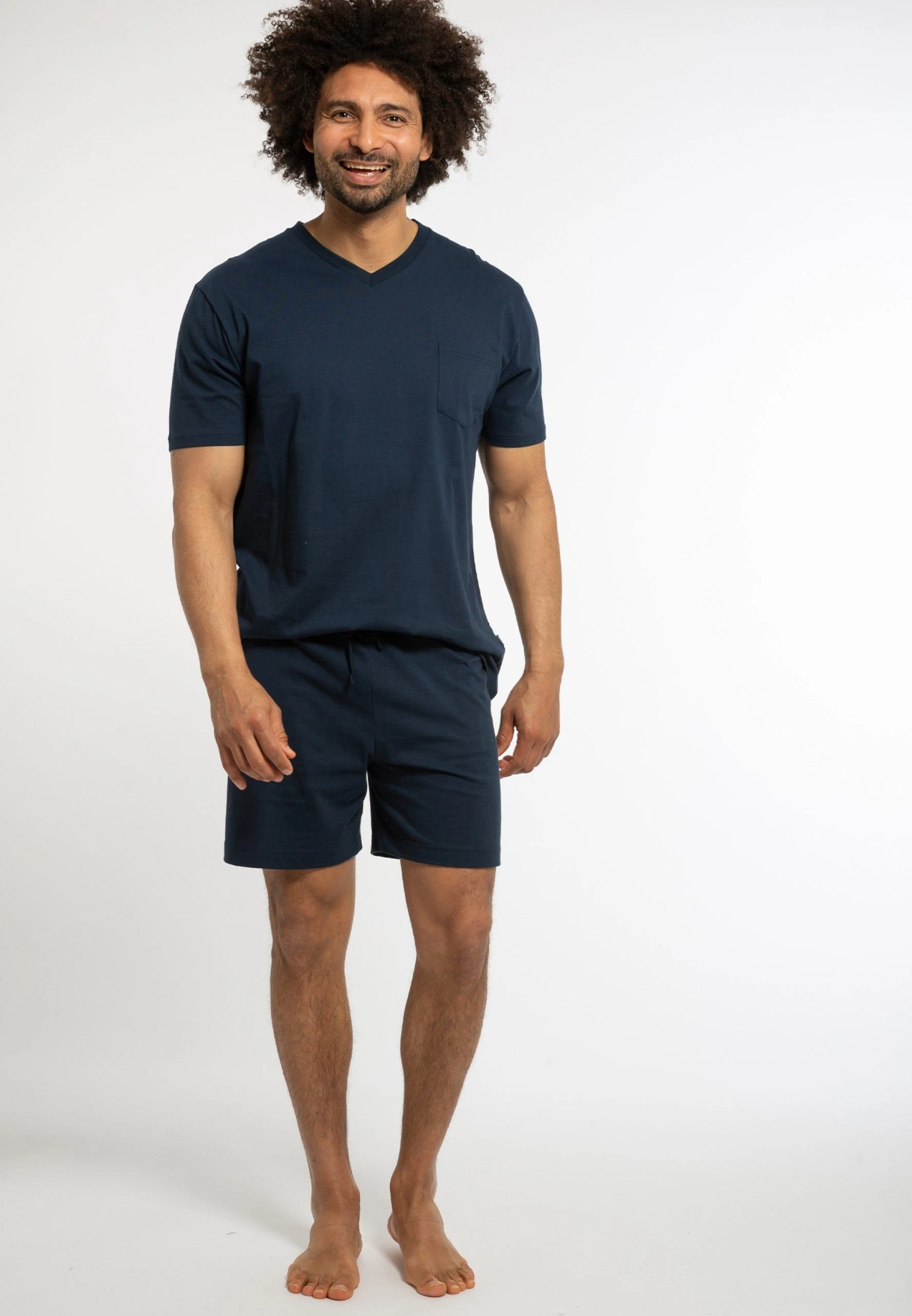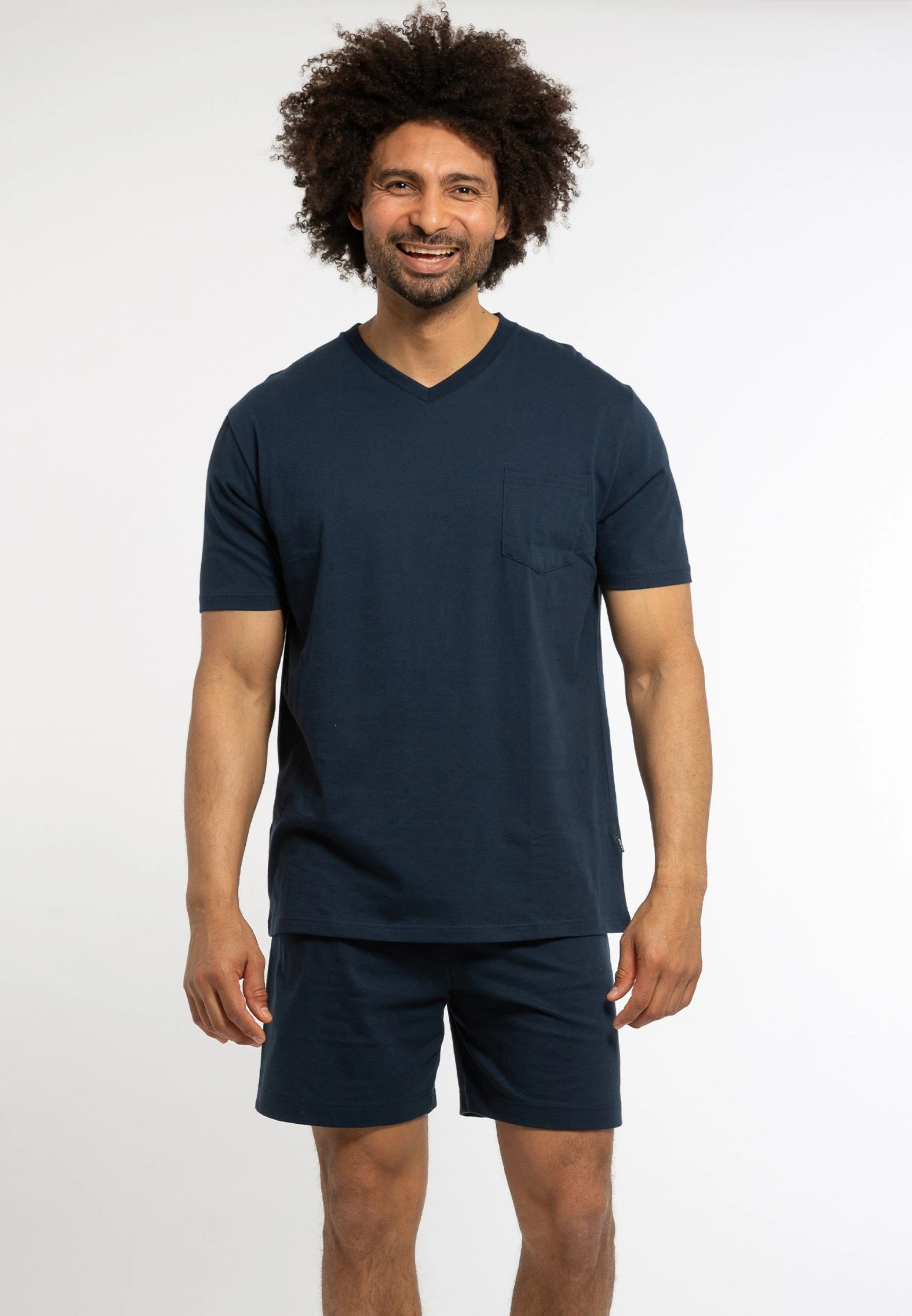 Der kurze Herrenschlafanzug aus Organic Cotton sorgt für ein angenehmes Tragegefühl und entspannte Nächte. Das Shirt mit V-Ausschnitt verspricht eine sportliche Optik. Ein praktisches Detail ist das Bindeband am Hosenbund. Zeitloses Design und ein legerer Schnitt komplettieren den gemütlichen Look und sorgen für ein angenehmes Tragegefühl.