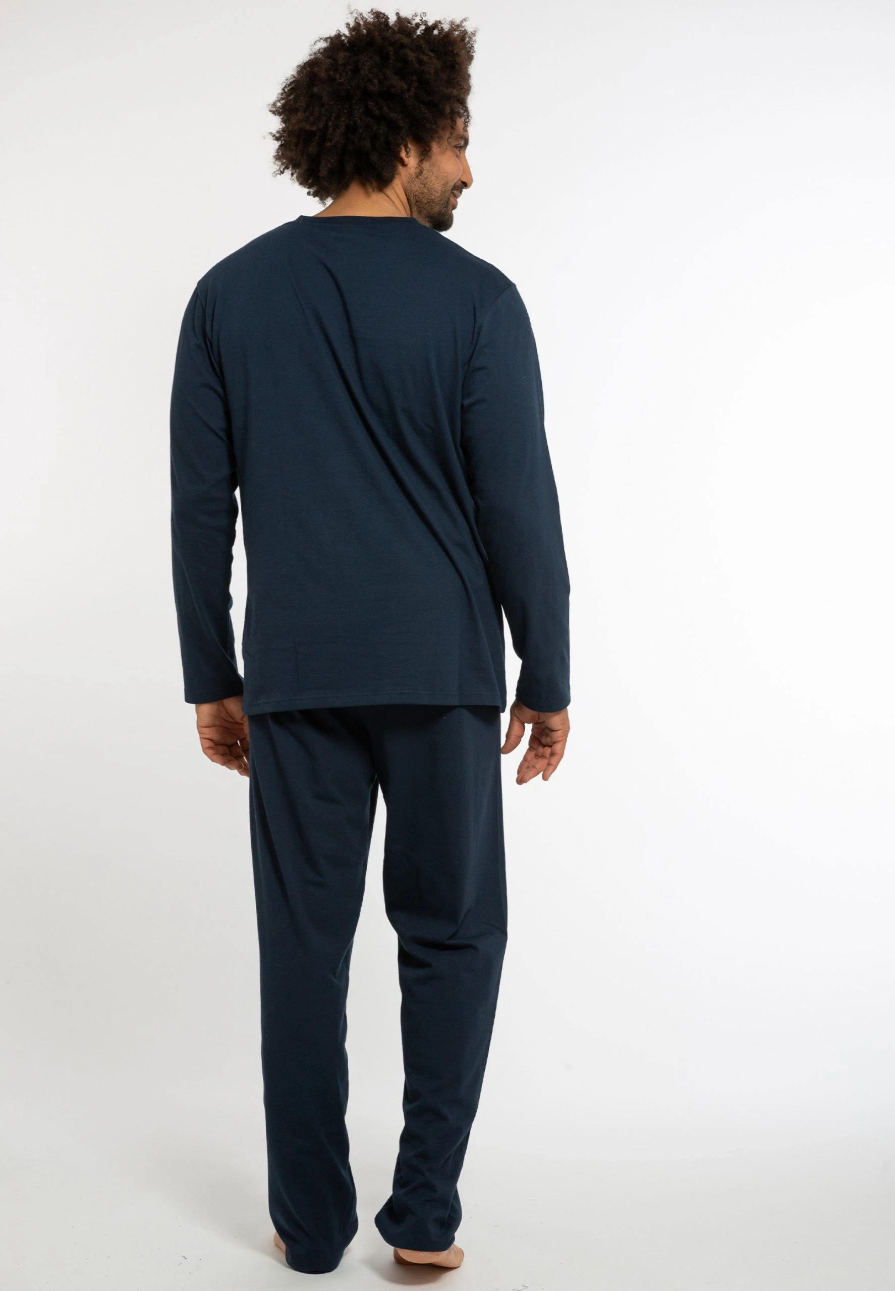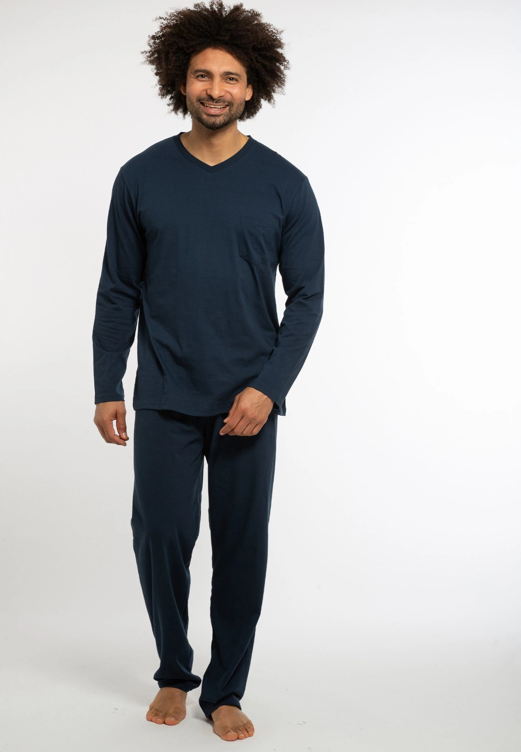 Dieser lange Herrenschlafanzug aus Organic Cotton sorgt für ein angenehmes Tragegefühl und entspannte Nächte. Das Shirt mit V-Ausschnitt verspricht eine sportliche Optik. Ein praktisches Detail ist das Bindeband am Hosenbund. Zeitloses Design und ein legerer Schnitt komplettieren den gemütlichen Look und sorgen für ein angenehmes Tragegefühl.