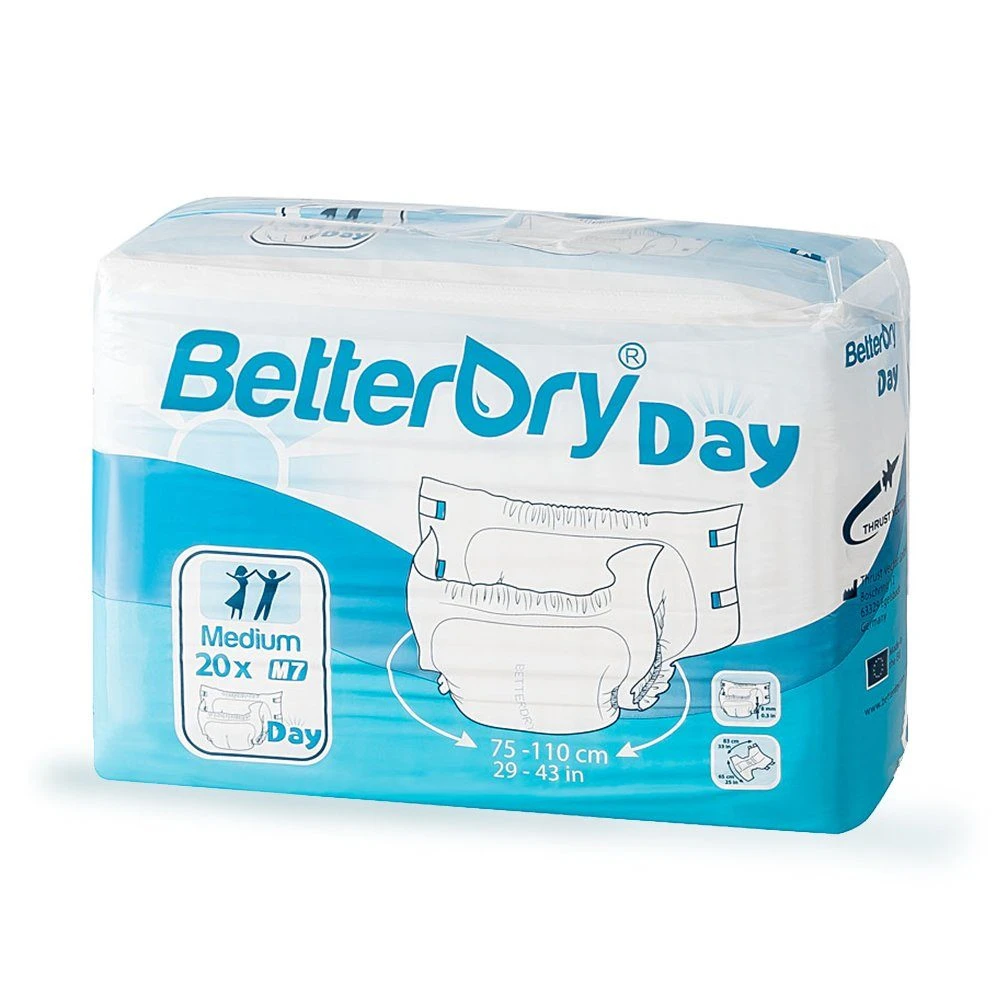 Eine Packung BetterDry M7 mit 80 Windeln in 4 Polybeuteln mit je 20 Windeln für einen Taillenumfang von 75-110 cm / 29-43 in.