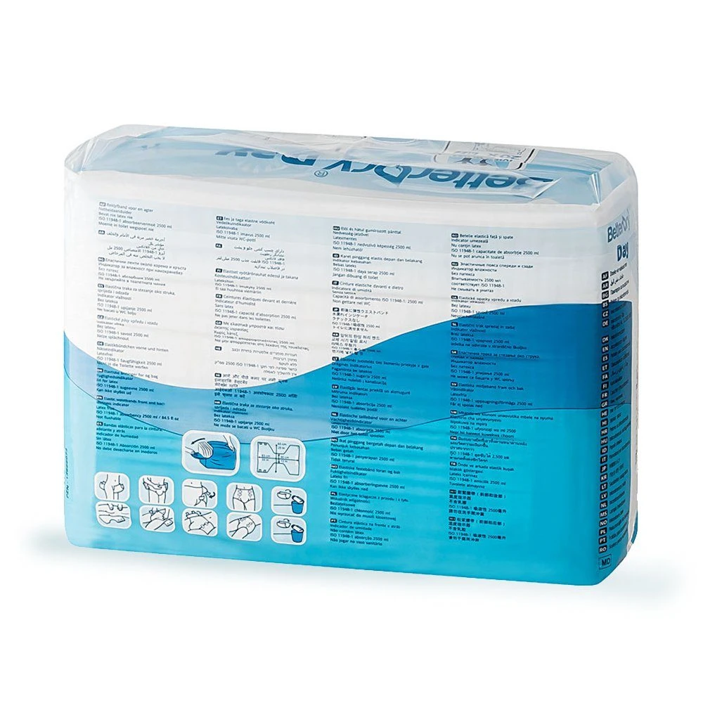 Die weiße Rückseite ist unter der Kleidung unauffällig, und die leicht elastische Außenhülle fühlt sich angenehm und leise an, wenn Sie sich bewegen. Die extra glatte, mikrotexturierte Kunststoffaußenseite verhindert ein Scheuern zwischen den Oberschenkeln, auch wenn Sie den ganzen Tag herumlaufen. Nach dem Gebrauch der Windeln können Sie sicher sein, dass sich kein verräterischer Geruch entwickelt, da die Anti-Geruchs-Komponenten in der Windel diesen eindämmen. Ein Nässeindikator, der verschwindet, wenn die Windel nass ist, hilft dem Pflegepersonal zu erkennen, wann ein Wechsel erforderlich ist.