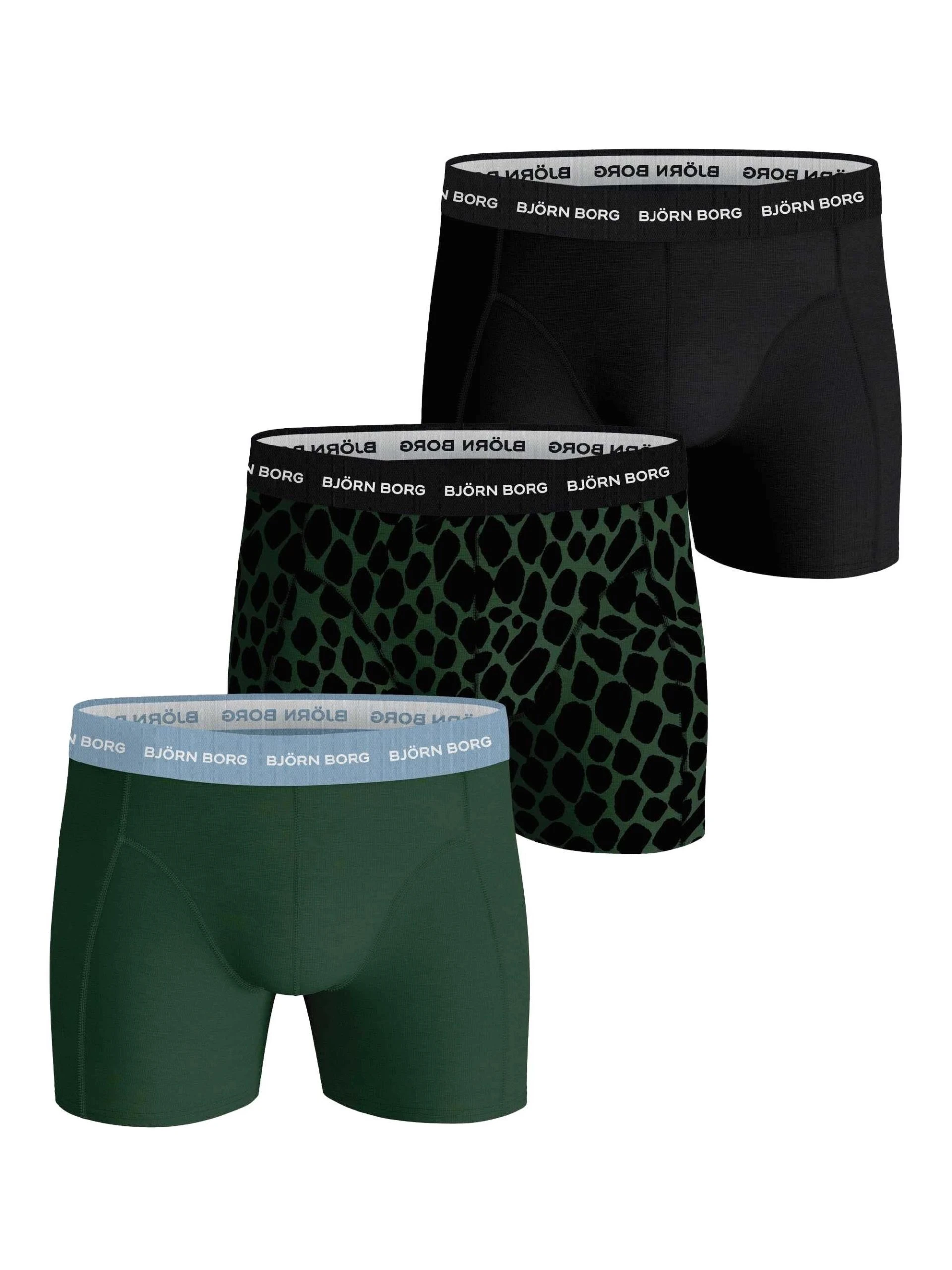 Herren Boxershorts von der Marke Björn Borg. Im praktischen 3er Pack. Jeweils mit einer gemusterten und zwei einfarbigen Shorts. Angenehmer Tragekomfort danke Baumwollmischung.