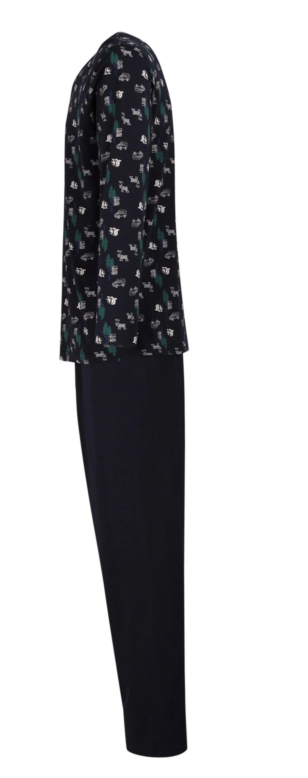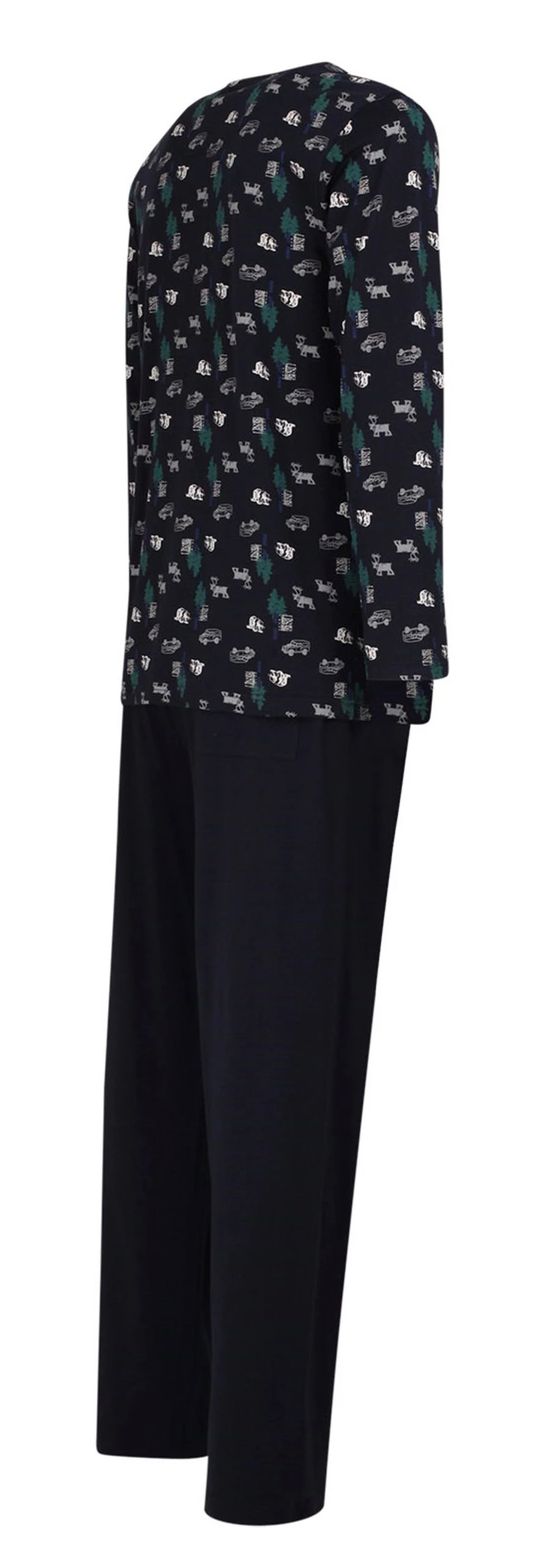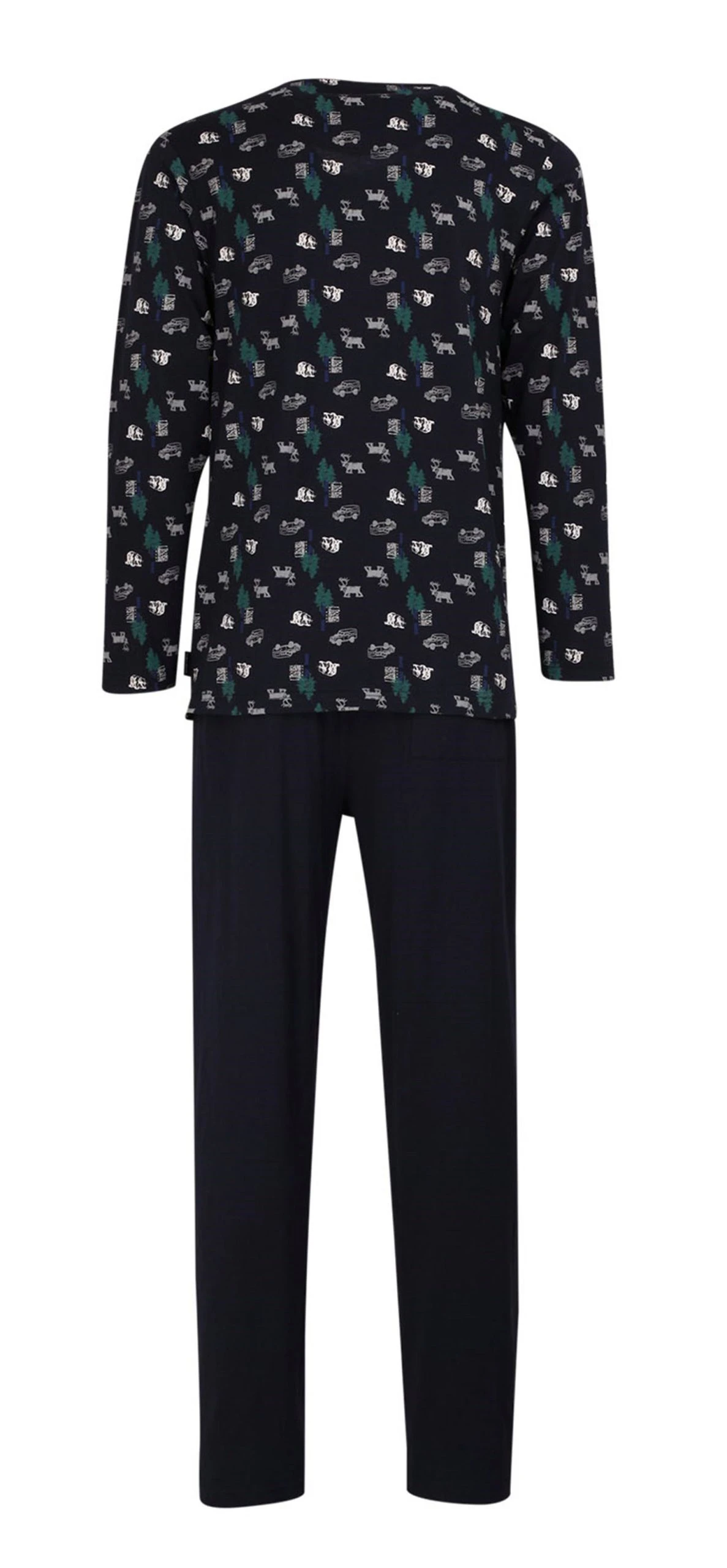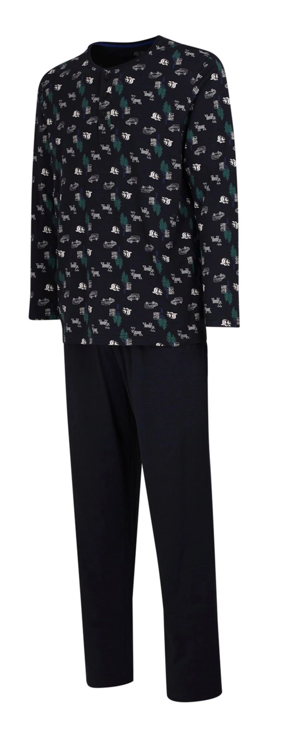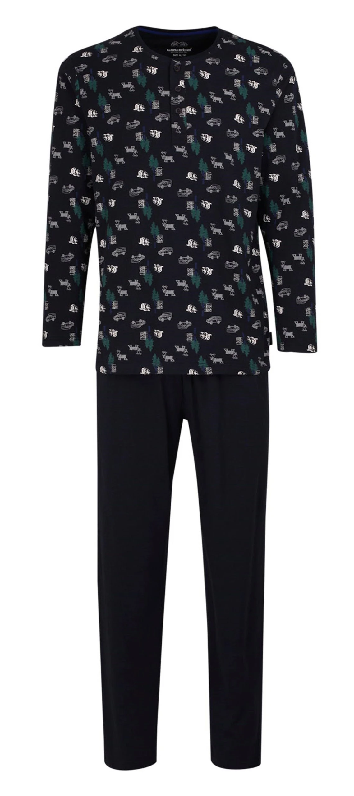 Ceceba Herren Schlafanzug. Material: 100% Baumwolle. Das gemusterte Shirt hat einen Rundhals Ausschnitt und eine Knopfleiste. Die Hose ist unifarben mit Gummizug