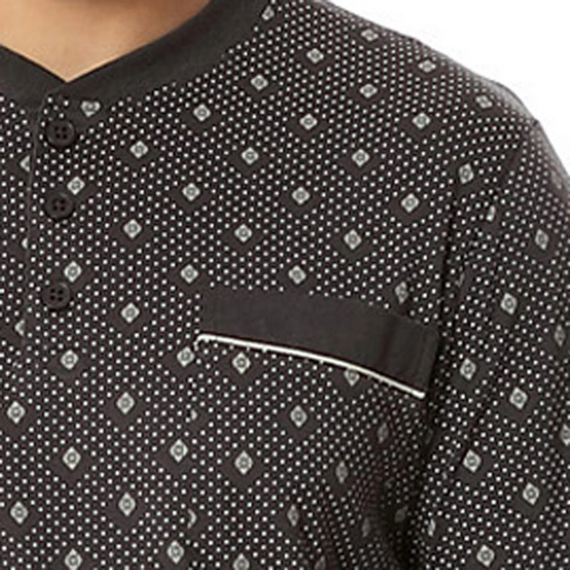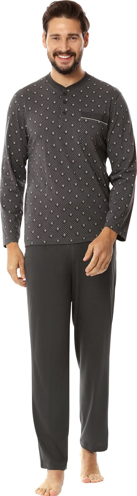 Comte Single-Jersey Herren-Schlafanzug. Die Nachtwäsche in legerer Passform lädt zum Relaxen und Träumen ein. Oberteil im schicken Allovermuster mit Knopfleiste am Rundhalsausschnitt und aufgesetzter, paspelierter Brusttasche. Dazu passt die einfarbige lange Hose mit abgestepptem Gummibund perfekt. Gerne lassen Sie sich von dem besonders weichen Material verwöhnen. Es begeistert durch sein angenehmes Hautgefühl und seinen hohen Tragekomfort.