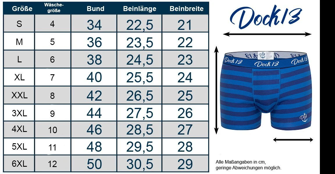 Die Dock13 Boxershorts „Grömitz“ ist eine Herren Boxershorts in unserem Schnitt „Regular Retro“. Sie ist eine enganliegende, klassische Männer Unterhose mit mittlerer Beinlänge, welche sich durch einen passgenauen Sitz auszeichnet. Das weiche und strapazierfähige Baumwollmaterial erweist sich durch seine Dehnbarkeit als optimaler Wegbegleiter in jeder Lebenssituation. Unsere „Regular Retroshorts“ wurden dafür konzipiert, dass Sie bequem sitzt und auch problemlos beim Sport getragen werden kann. Wir setzen auf beste Qualität. Unser Bund ist gewebt und nicht gedruckt. Für unser Logo nutzen wir eine Stickerei, damit dieses auch nach mehreren Wäschen noch wie neu aussieht!