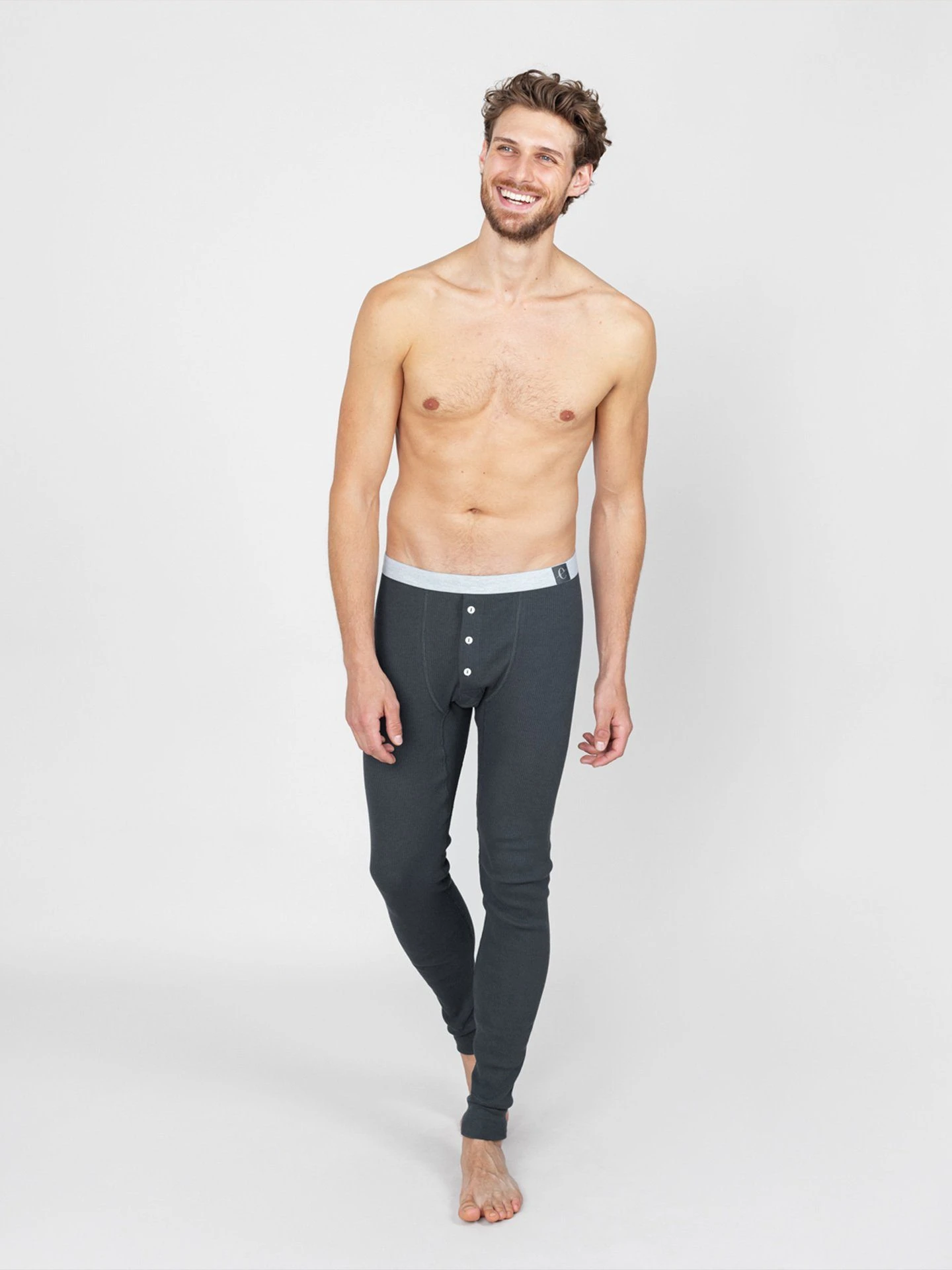 Skifahren oder auf der Hüttn faulenzen – geht beides stilecht mit Bernhard! Gut sitzende, formbeständige Baumwoll (kbA) Doppelrippe, Knopfleiste und angenehme Feinrippbündchen an den Fesseln sorgen für winterliches Wohlfühlgefühl.