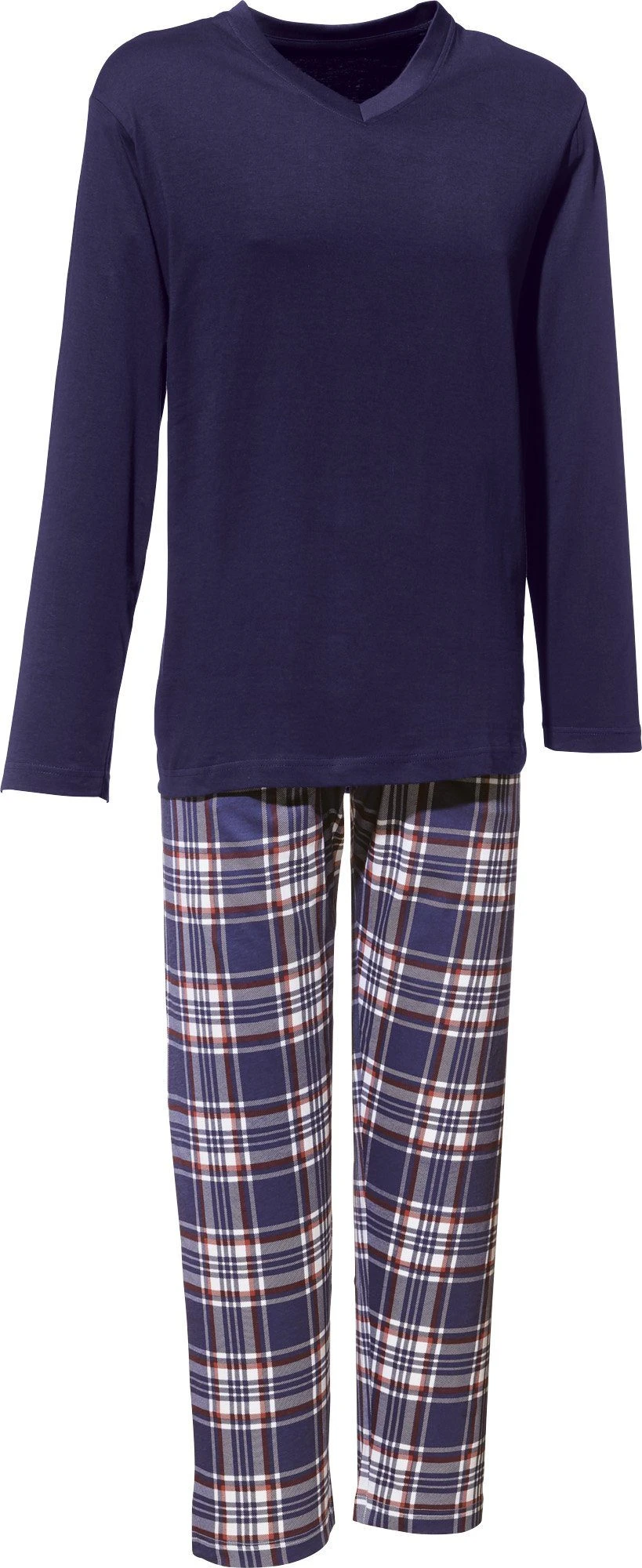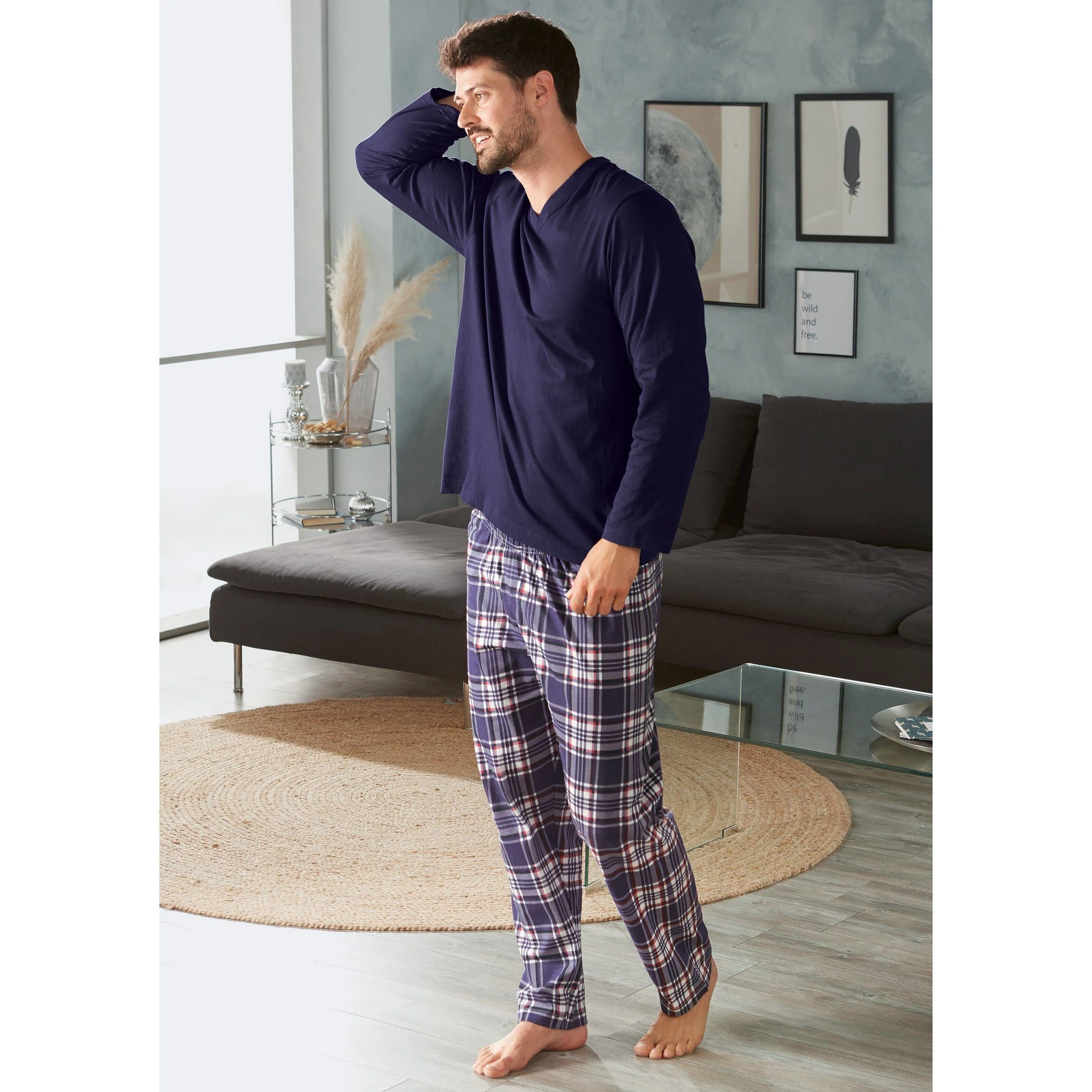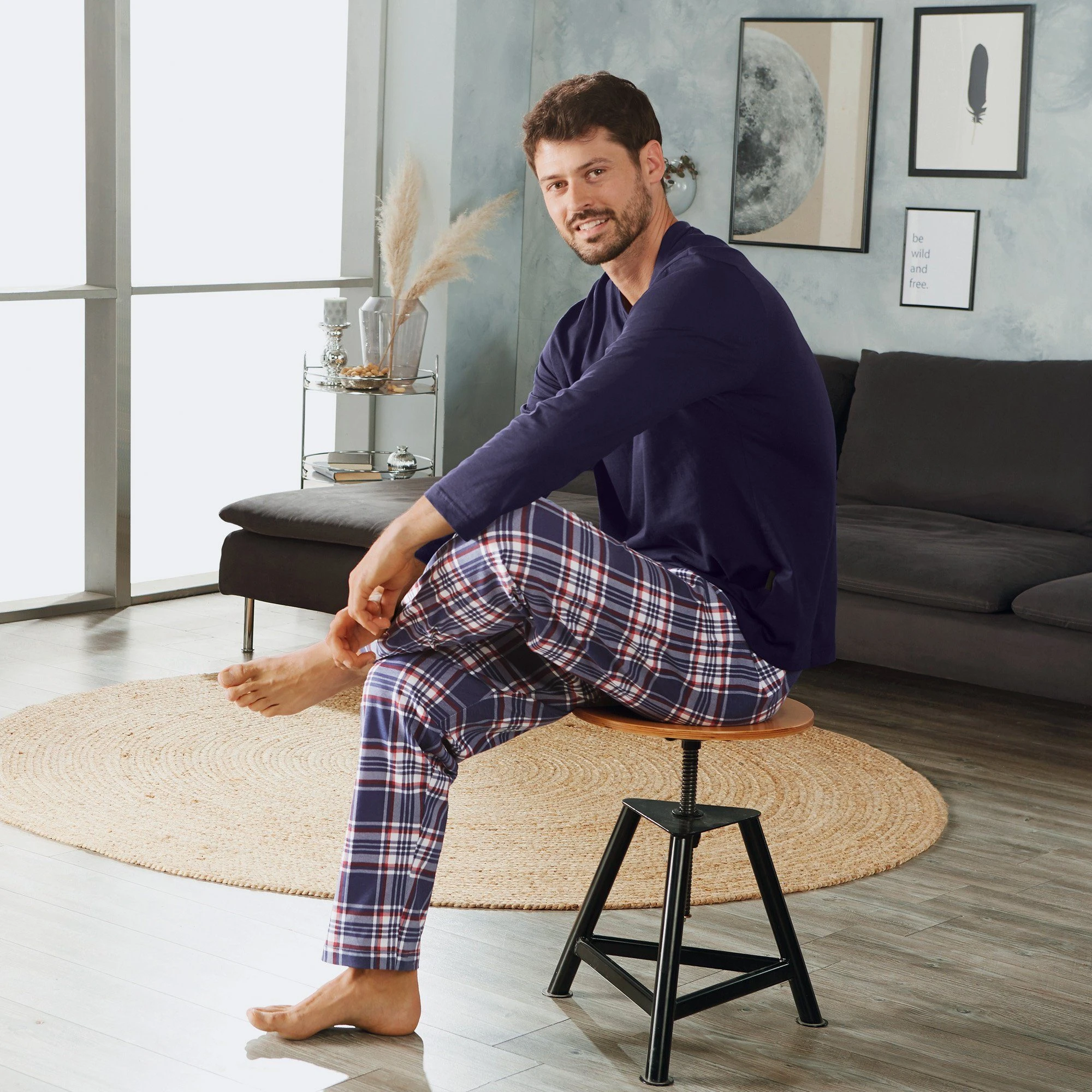 Erwin Müller Single-Jersey Herren-Schlafanzug. Modern und leger wirkt der Mix aus Uni und klassischem Karo. Zum Oberteil mit V-Ausschnitt wird die lange Hose mit abgestepptem Gummibund und Eingriffstaschen kombiniert. Gerne lassen Sie sich von der angenehmen Qualität, dem weichen Griff, der guten Passform und dem bequemen Tragegefühl verwöhnen. Ein Wohlfühlstück, das hautfreundlich und atmungsaktiv ist.