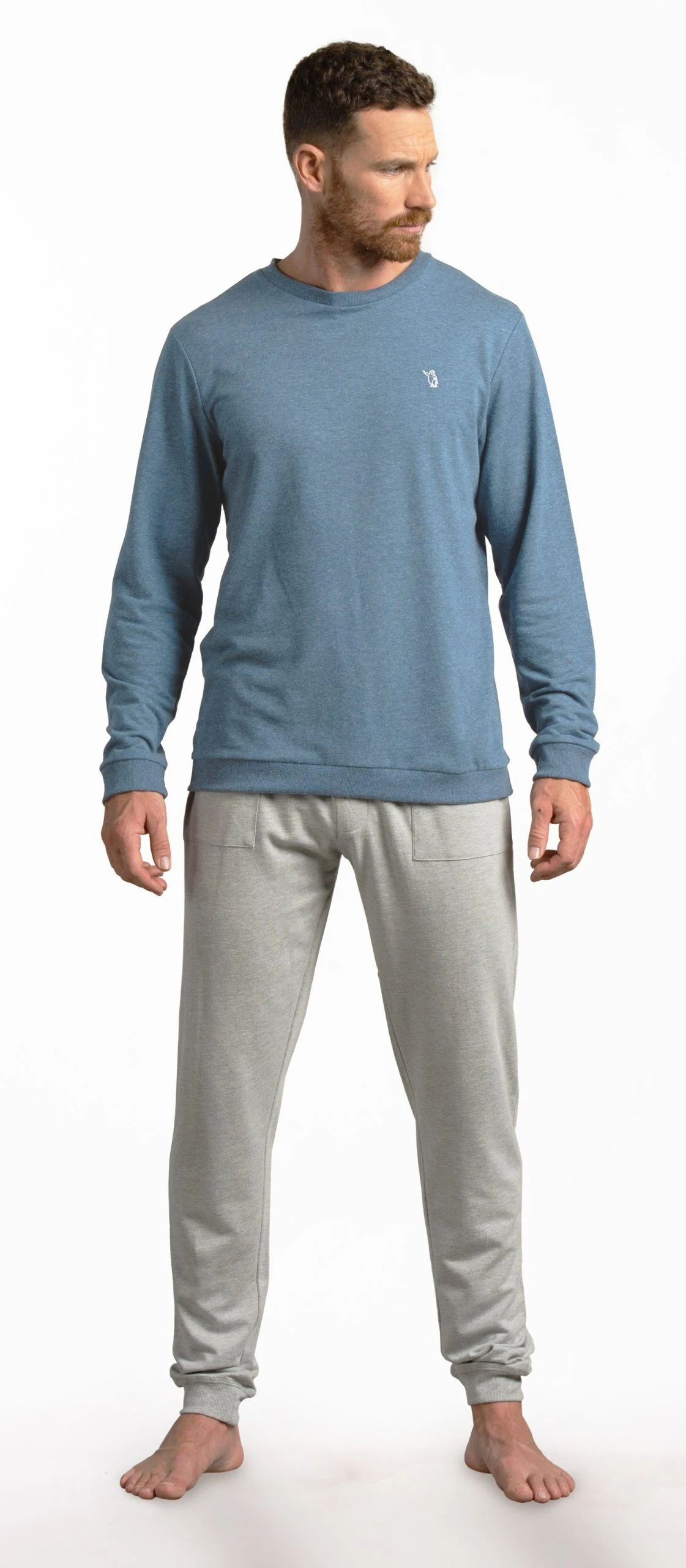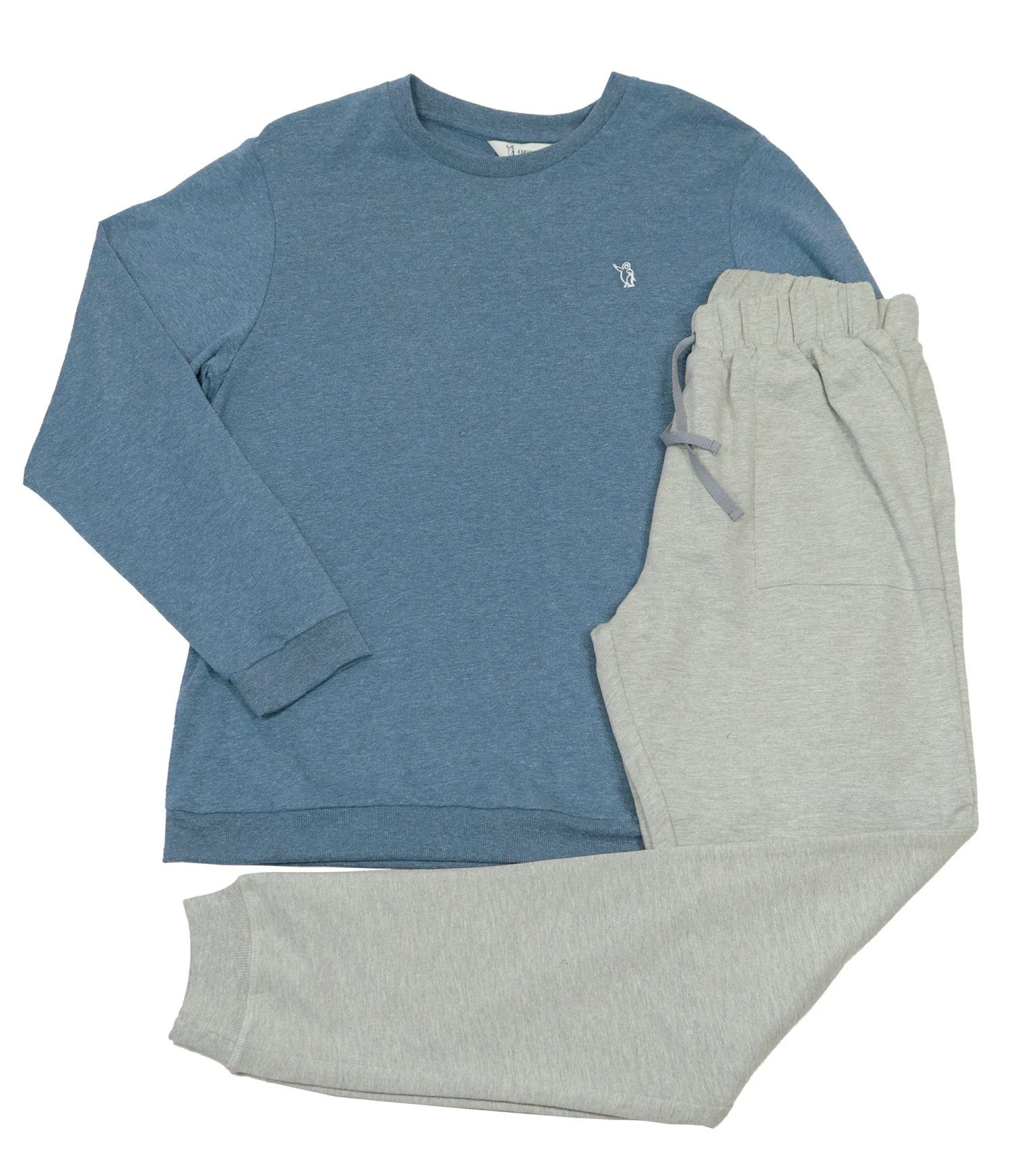 Eskimo Herren Schlafanzug Nicht nur zum Schlafen! Produktdetails: marineblaues Oberteil, lange Ärmel, Bündchen um die Handgelenke, Länge des Oberteils in Größe M: 72 cm, Hose in grauem Mix, elastischer Bund und Kordelzug, 2 Taschen, Schrittlänge in Größe M: 80 cm