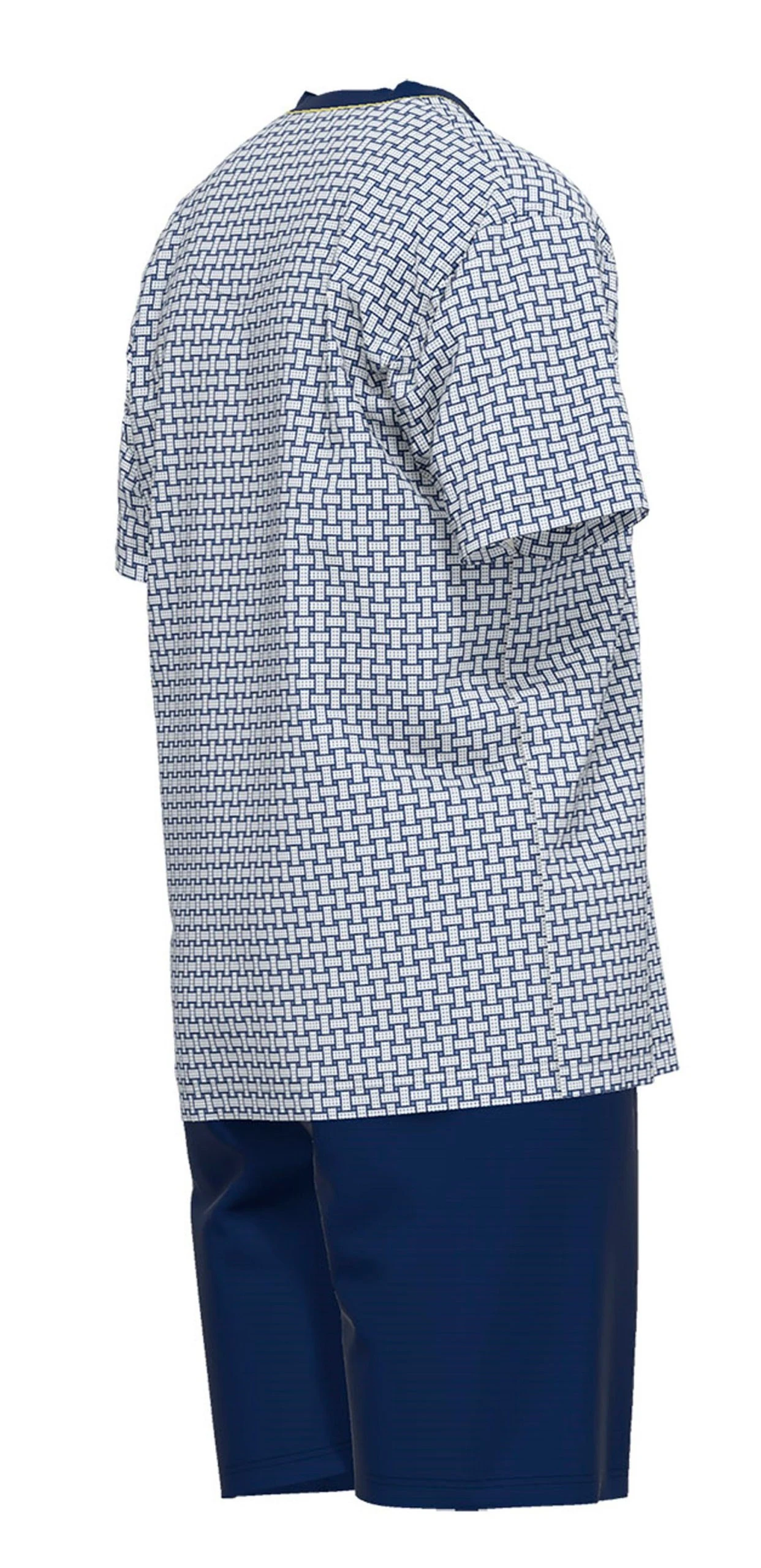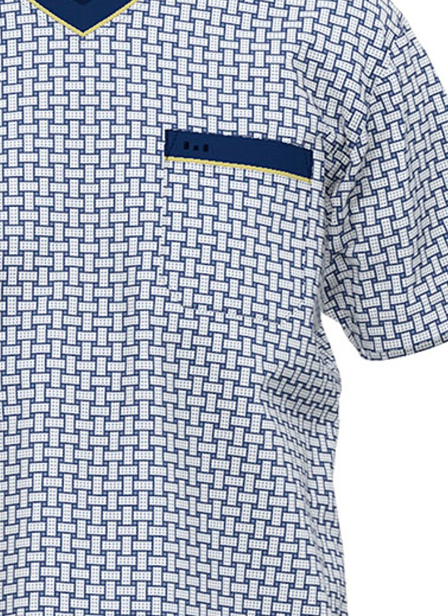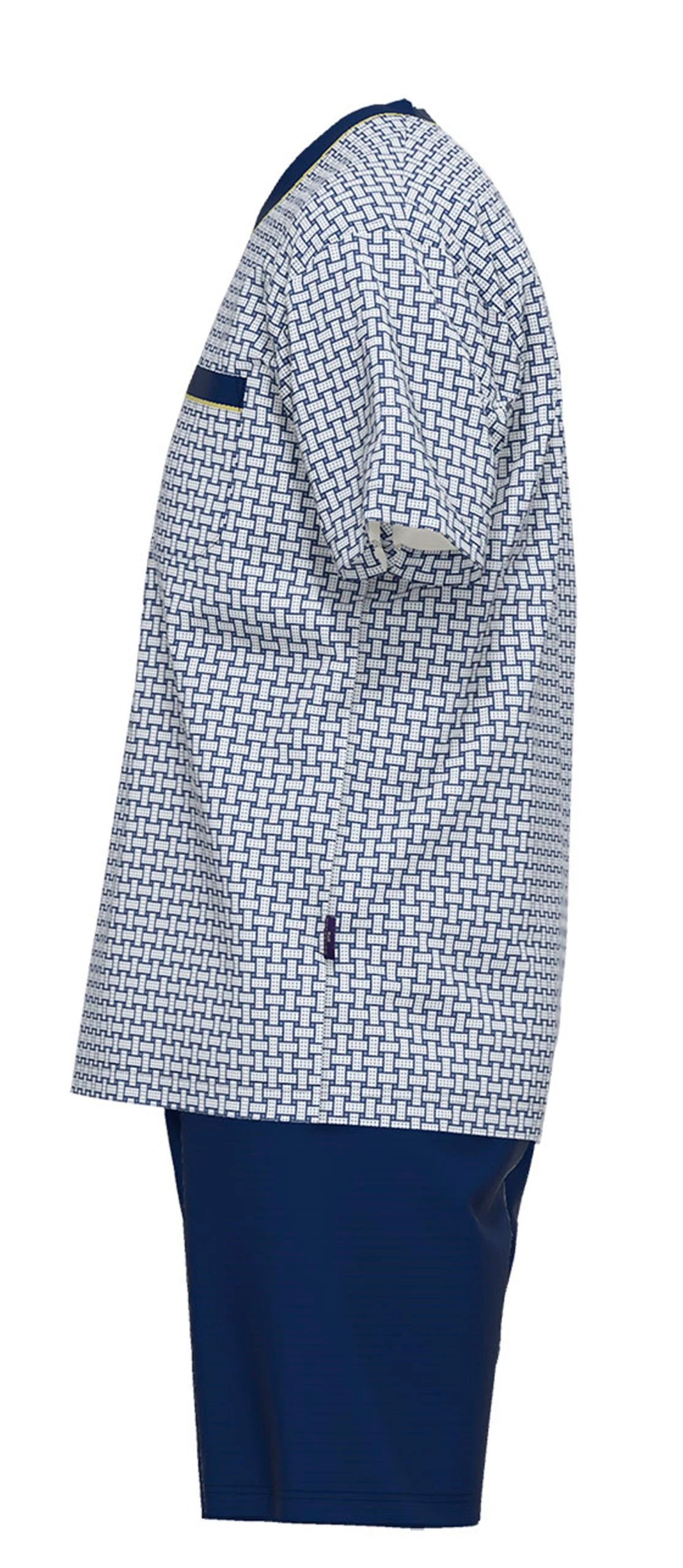 Götzburg Herren Schlafanzug kurz. Material: 100% Baumwolle, Single Jersey Qualität. Das Oberteil hat einen V Ausschnitt und kurze Arme. Die Hose ist unifarben und mit Gummizug.