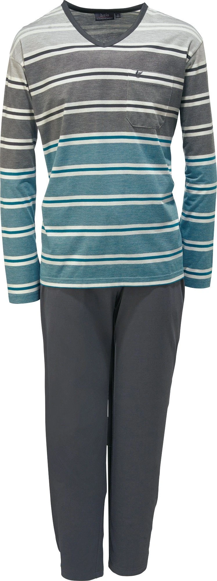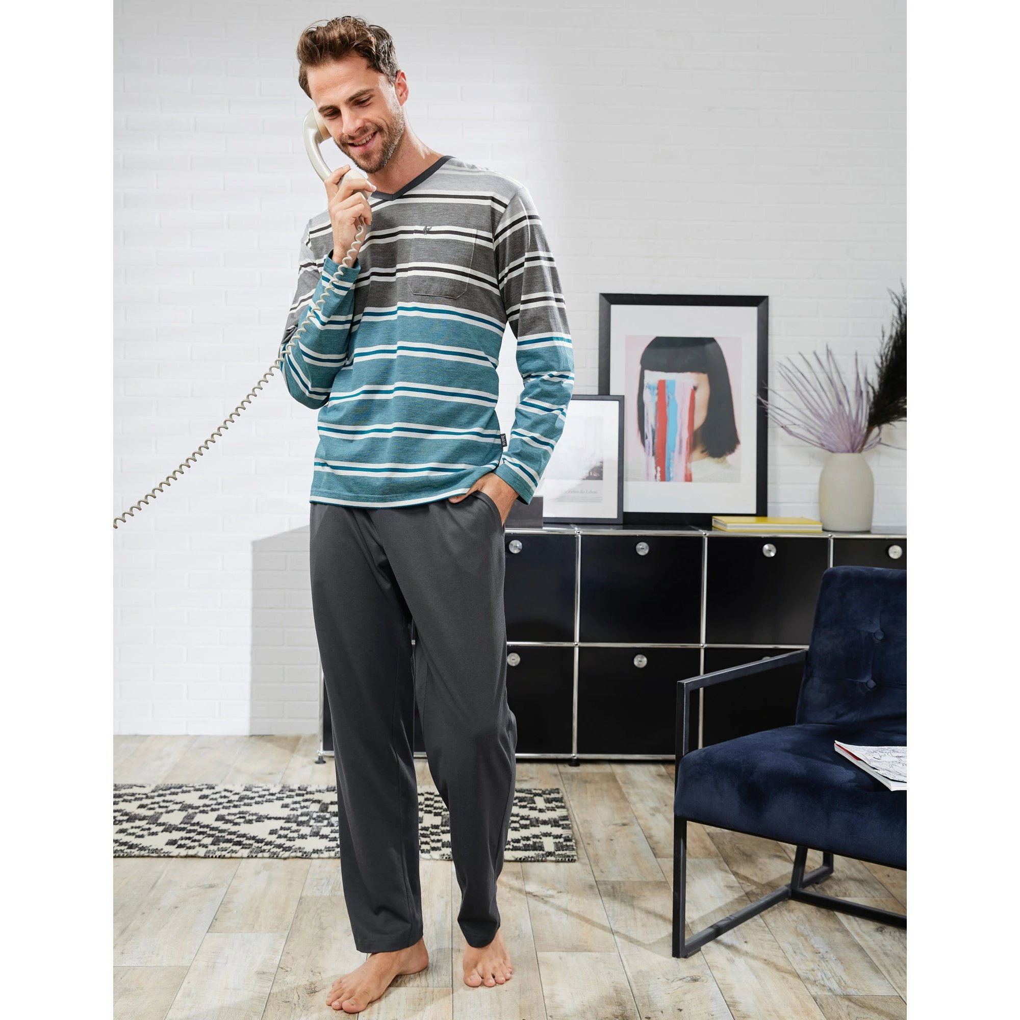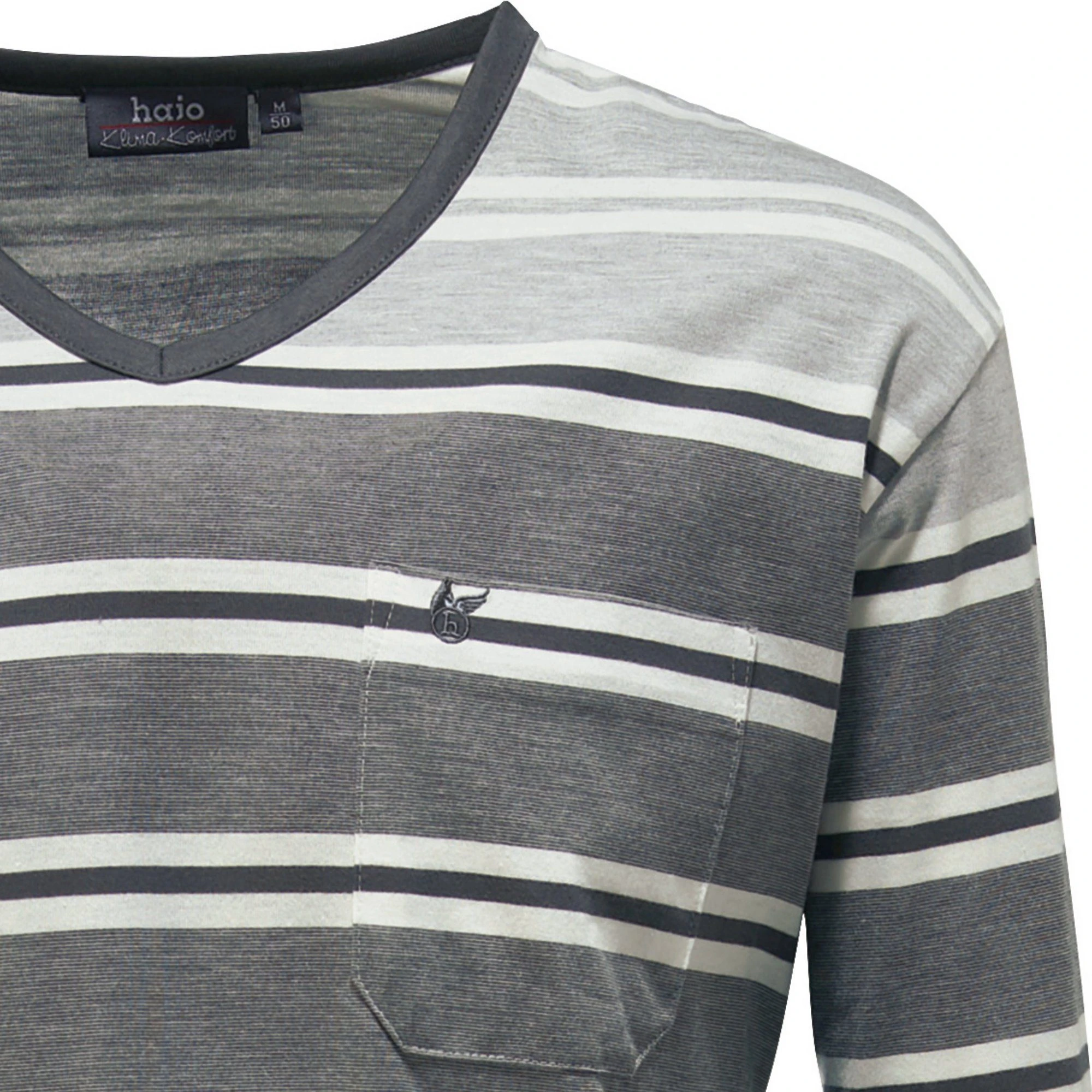 Hajo Single-Jersey Herren-Schlafanzug. In Klima-Komfort-Qualität. Die temperaturausgleichende Faser vereint die Vorteile hochwertigster Materialien zu einem pflegeleichten Stoff mit einmaligem Tragekomfort für ein angenehm trockenes Schlafklima. Sie erkennen die Exklusivität am edlen Glanz und dem ausgesprochen weichen, seidigen Griff. Oberteil mit gestrickten Ringeln, V-Ausschnitt, logobestickter Brusttasche und kleinen Seitenschlitzen. Dazu wird die einfarbige Hose in offener Form mit abgestepptem Gummibund, farbigem Durchzugsband und Eingriffstaschen getragen. Aus mercerisierten, supergekämmten Baumwollgarnen und feinster Microfaser. Der komfortable Schnitt und die sorgfältige Verarbeitung bilden eine gute Basis für erholsamen Schlaf.
