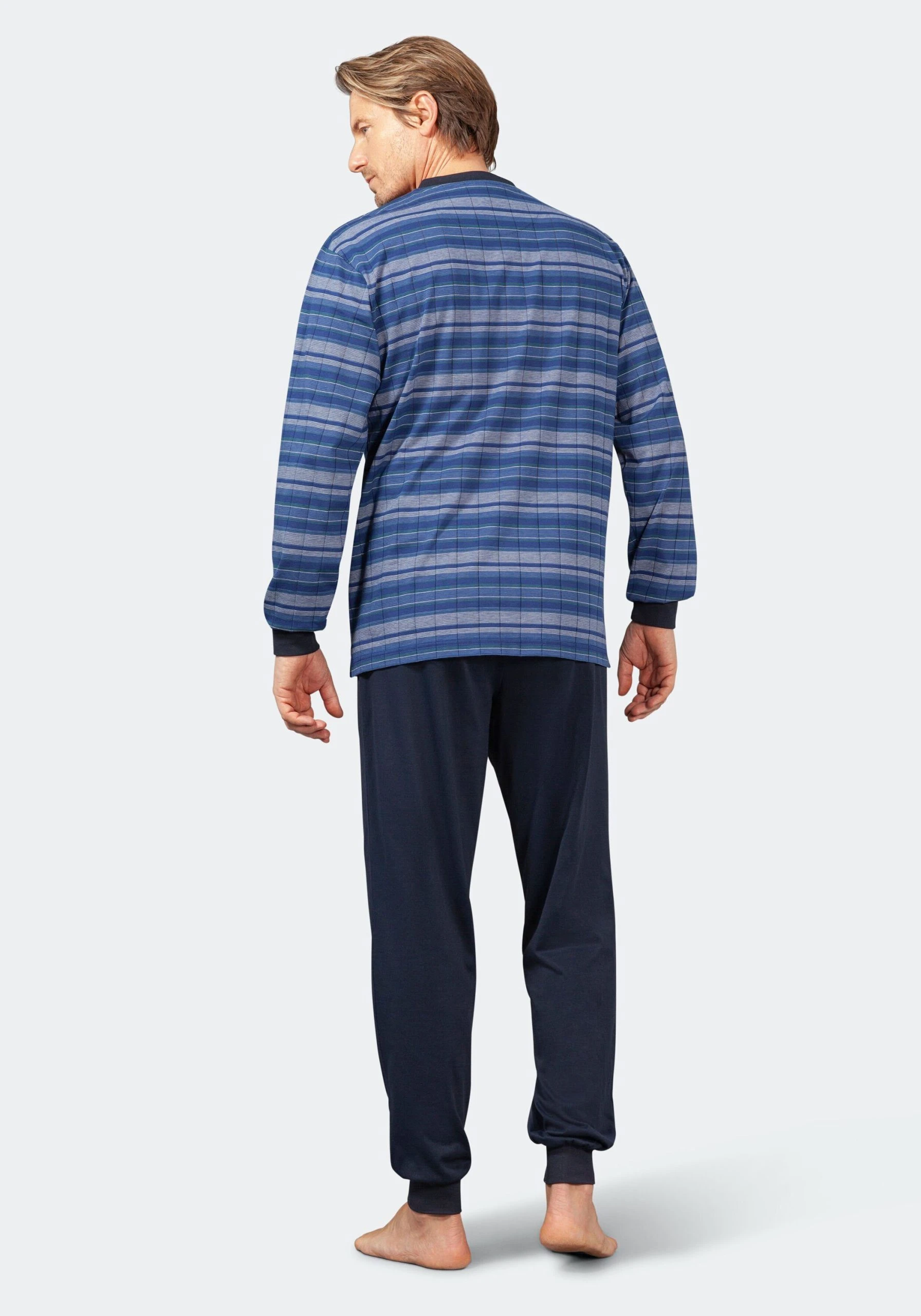 Schlafanzug von ‘hajo’. Oberteil: Rundhals mit 3-er Knopfleiste, garngefärbter Jacquard allover, offene aufgesetzte Brusttasche, offene Form, elastische Strickbündchen am Armabschluss. Hose: el. Gummibund mit Kordelzug, uni, lang, zwei Taschen, elastsiche Bündchen am Beinabschluss. Trageangenehm und pflegeleicht.