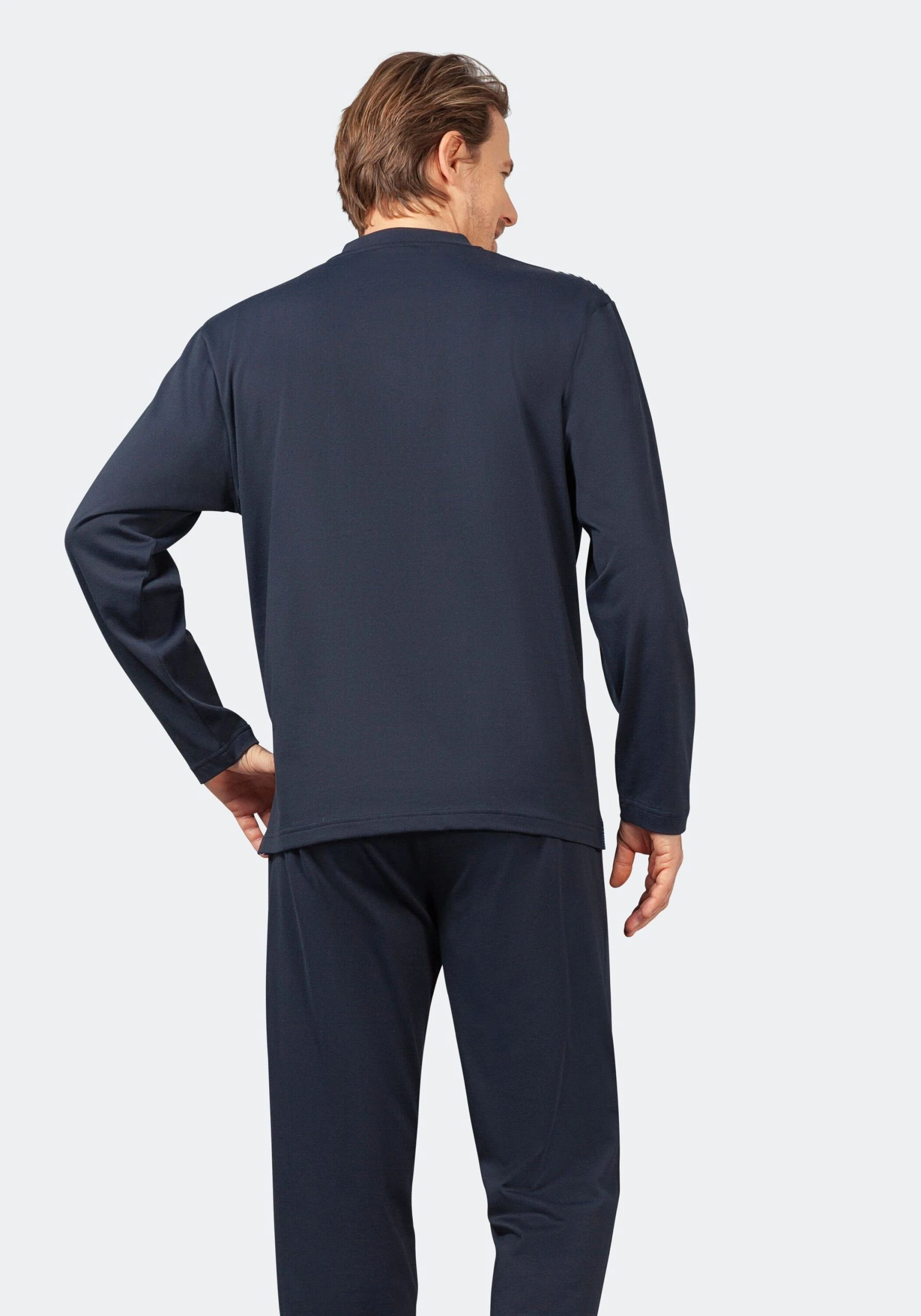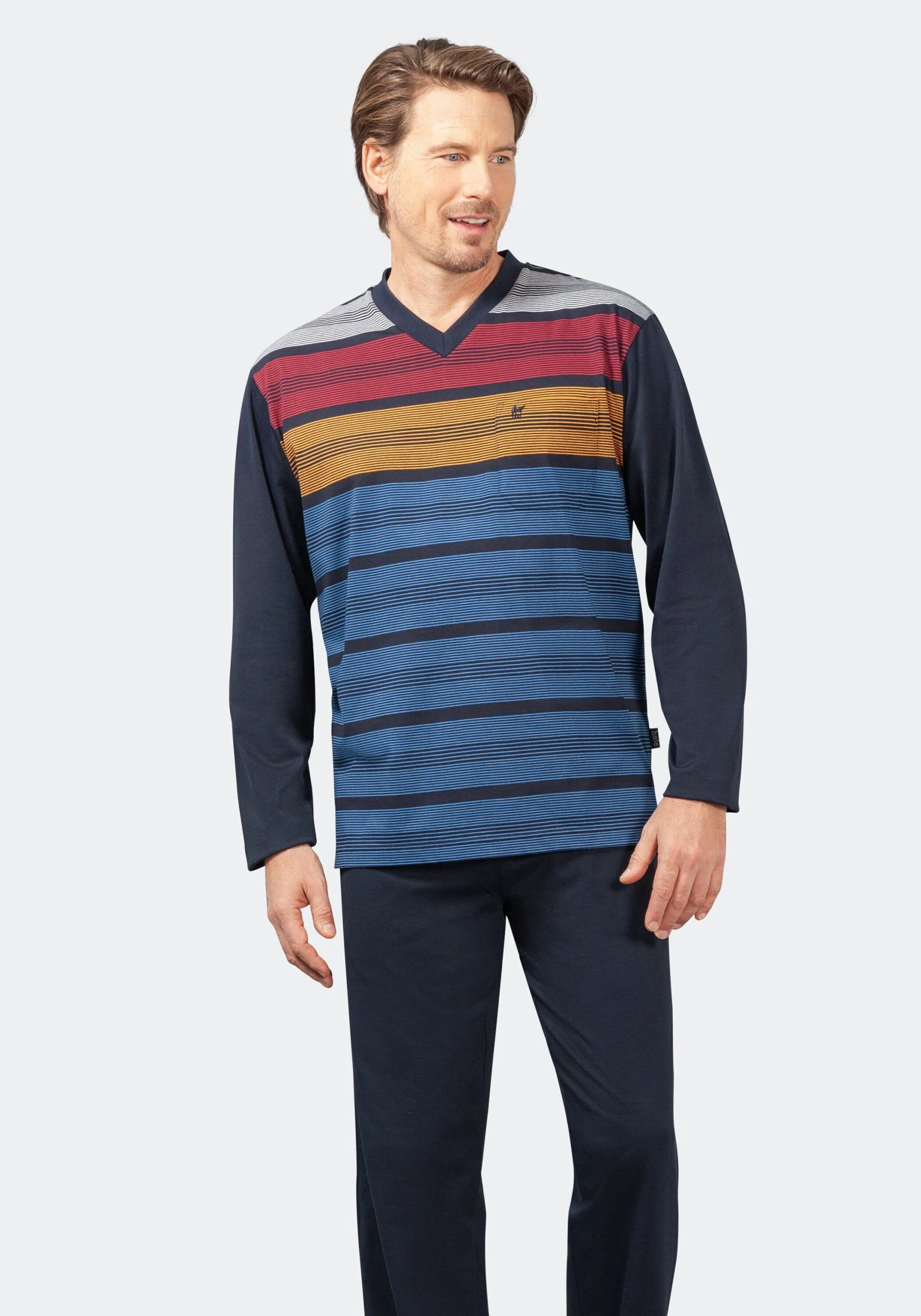 Schlafanzug von ‘hajo’. Oberteil: elastischer V-Ausschnitt, garngefärbter Streifeneinsatz im Vorderteil, Rücken und Ärmel uni, offene aufgesetzte Brusttasche, offene Form mit Seitenschlitzen. Hose: el. Gummibund mit Kordelzug, uni, lang, zwei Taschen, offene Form. Trageangenehm und pflegeleicht.