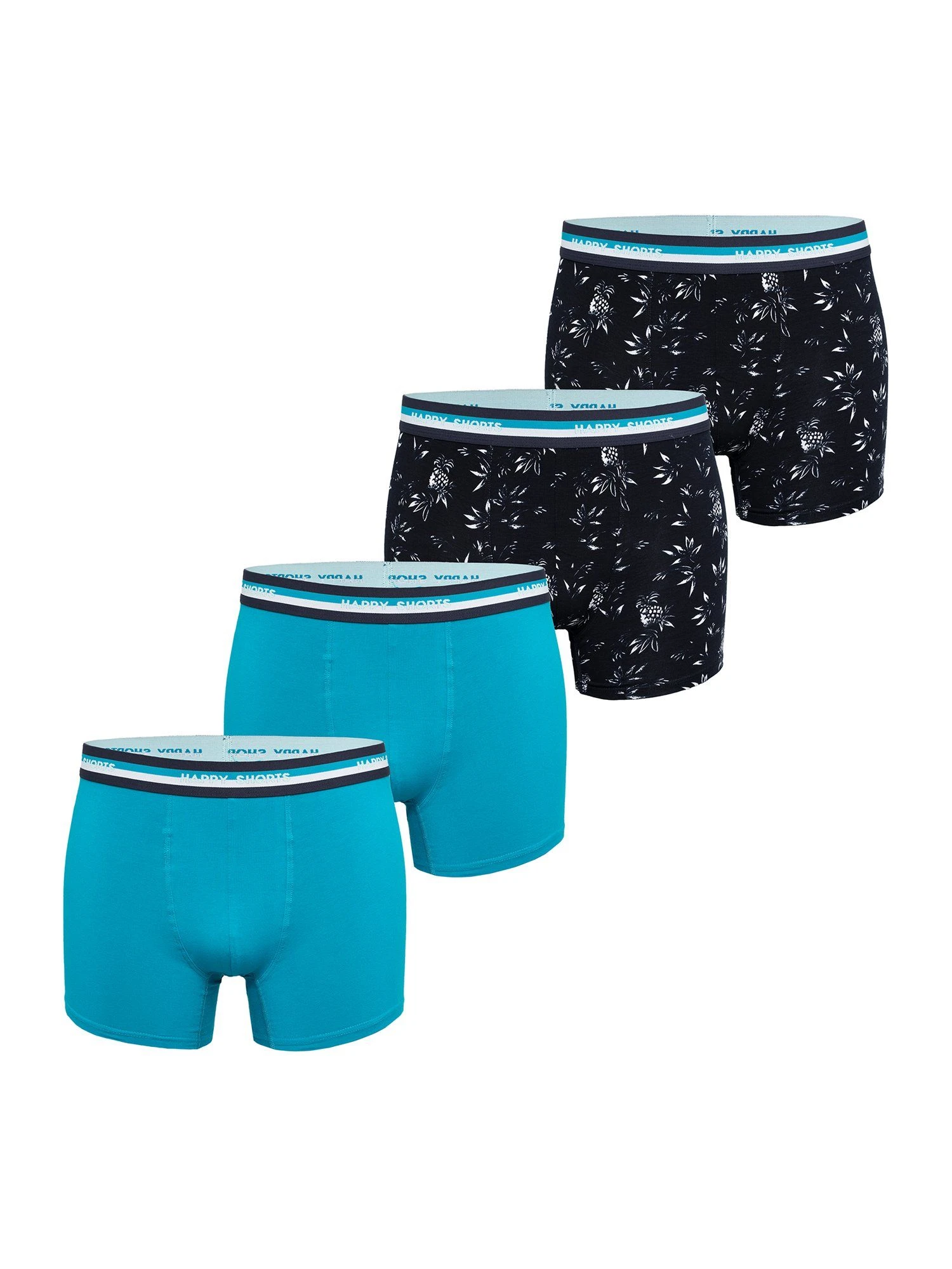Trunks im Multi-Pack von Happy Shorts, für alle die es bunt mögen! Die Sets bestehen aus vier Retroshorts in verschiedenen Ausführungen. Die liebevoll gestalteten Trunks bringen Abwechslung in den Kleiderschrank. Der Materialmix aus weicher Baumwolle und bequemen Stretchfasern gewährleistet Formstabilität und Tragekomfort. Die Shorts kommt ohne störende Nähte im Gesäßbereich aus. Der breite Kontrastbund gibt den Shorts optisch den letzten Schliff und sorgt dafür, dass sie nicht verrutscht und so auch unter Belastung dort bleibt, wo sie hingehört.