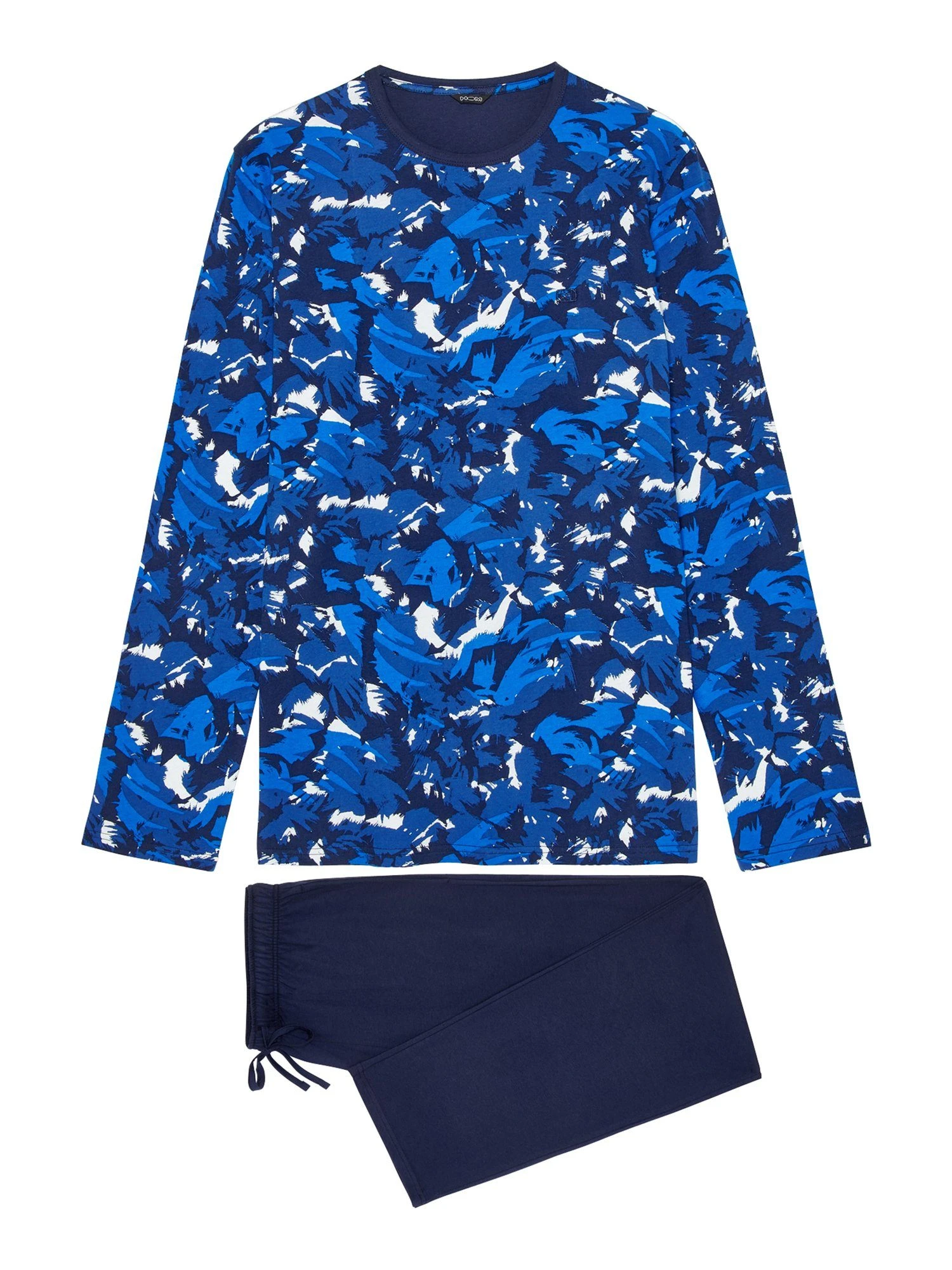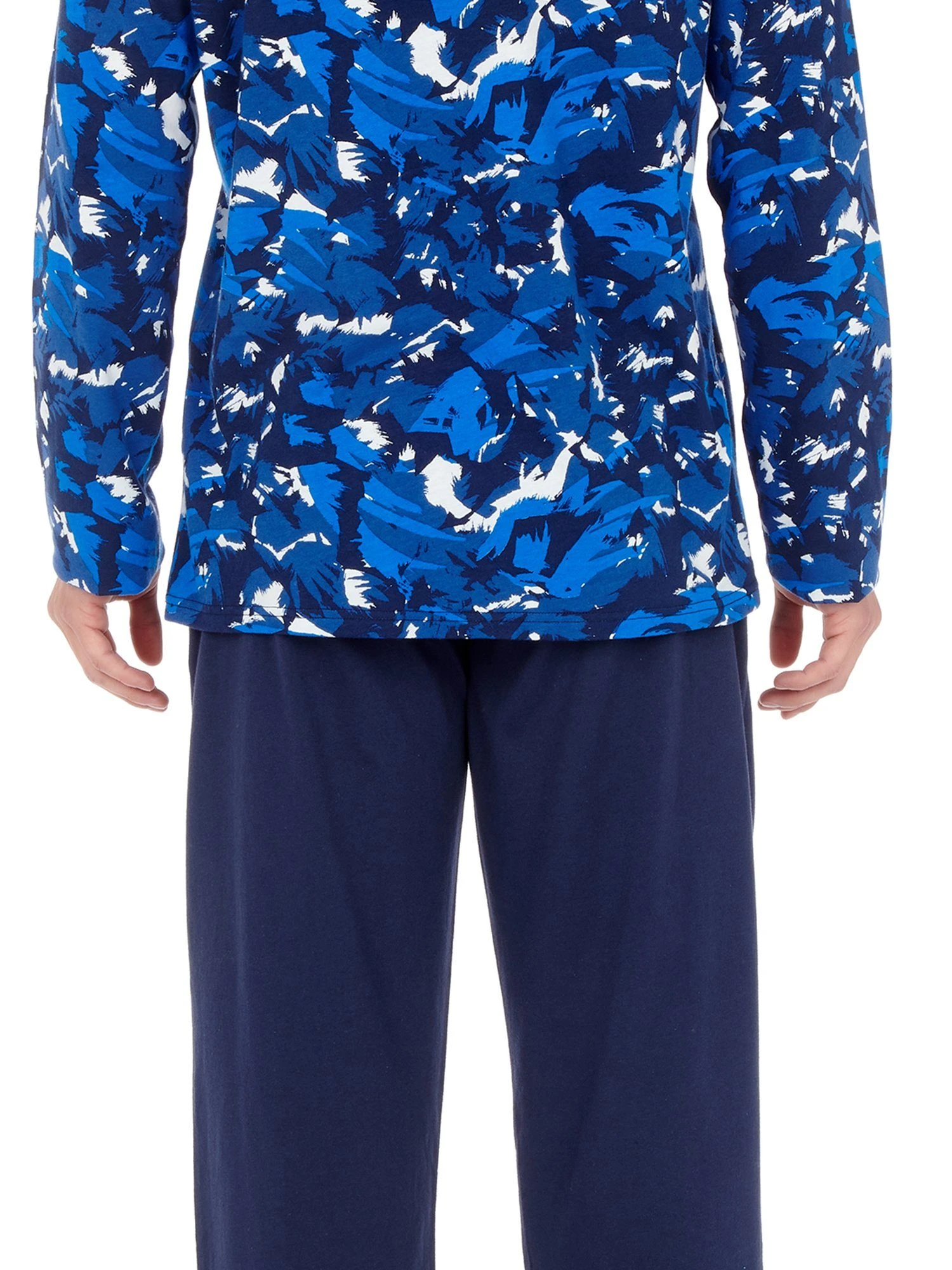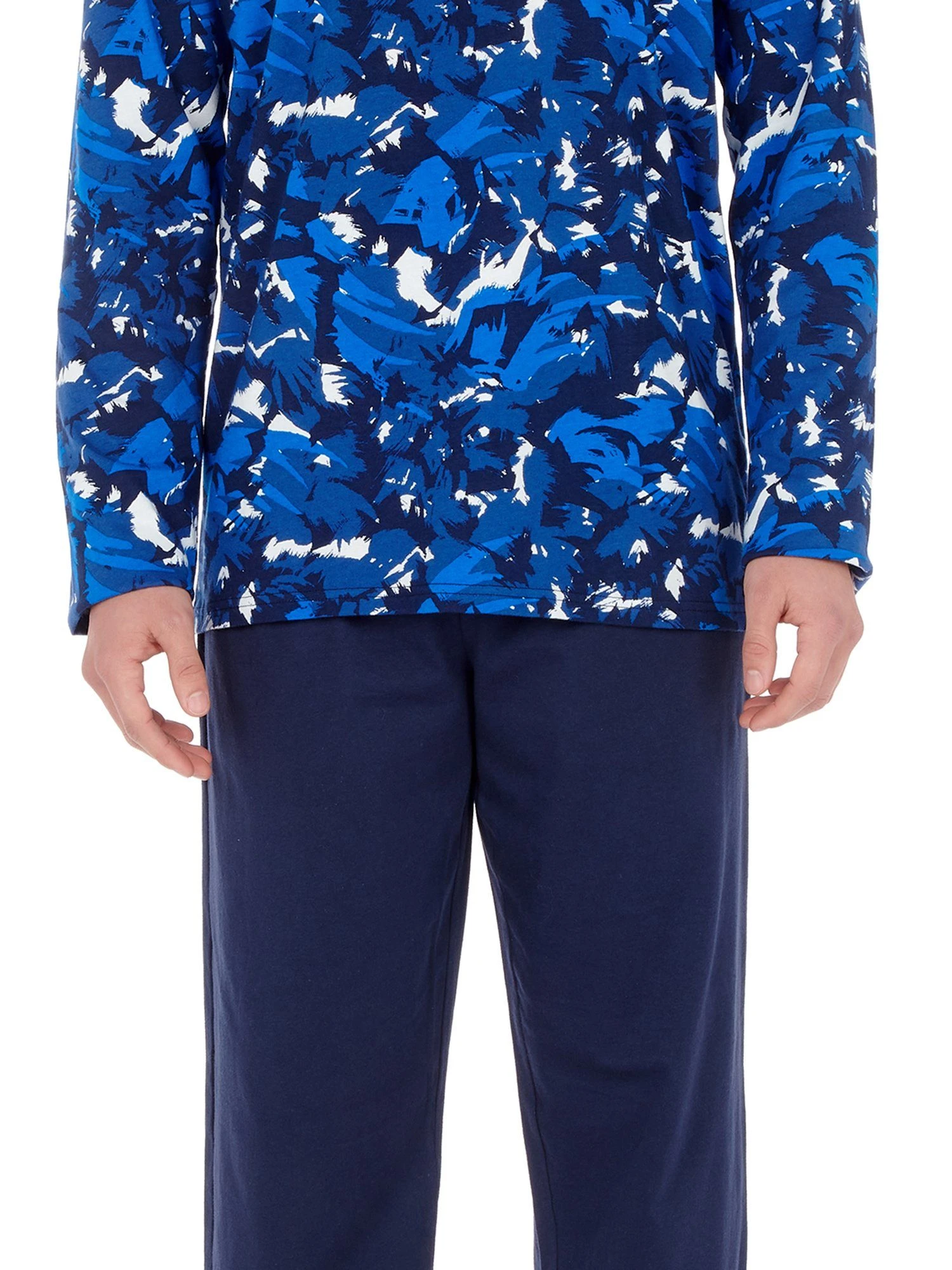 Der lange Pyjama MADRAGUE HOM ist ein Pyjama-Set für Herren aus ultraweichem Baumwoll-Interlock-Jersey. Es besteht aus einem langärmeligen Pyjama-T-Shirt mit Rundhalsausschnitt und einer passenden Hose. Das T-Shirt dieses Pyjamas ist mit einem stylischen floralen Motiv bedruckt. Das Unterteil dieses langen Herren-Pyjamas ist eine gerade geschnittene, einfarbige Schlaf-Hose mit zwei Seitentaschen im Saum und hat einen elastischen Bund, der in den 100%igen Baumwollstoff der Hose eingearbeitet ist.
