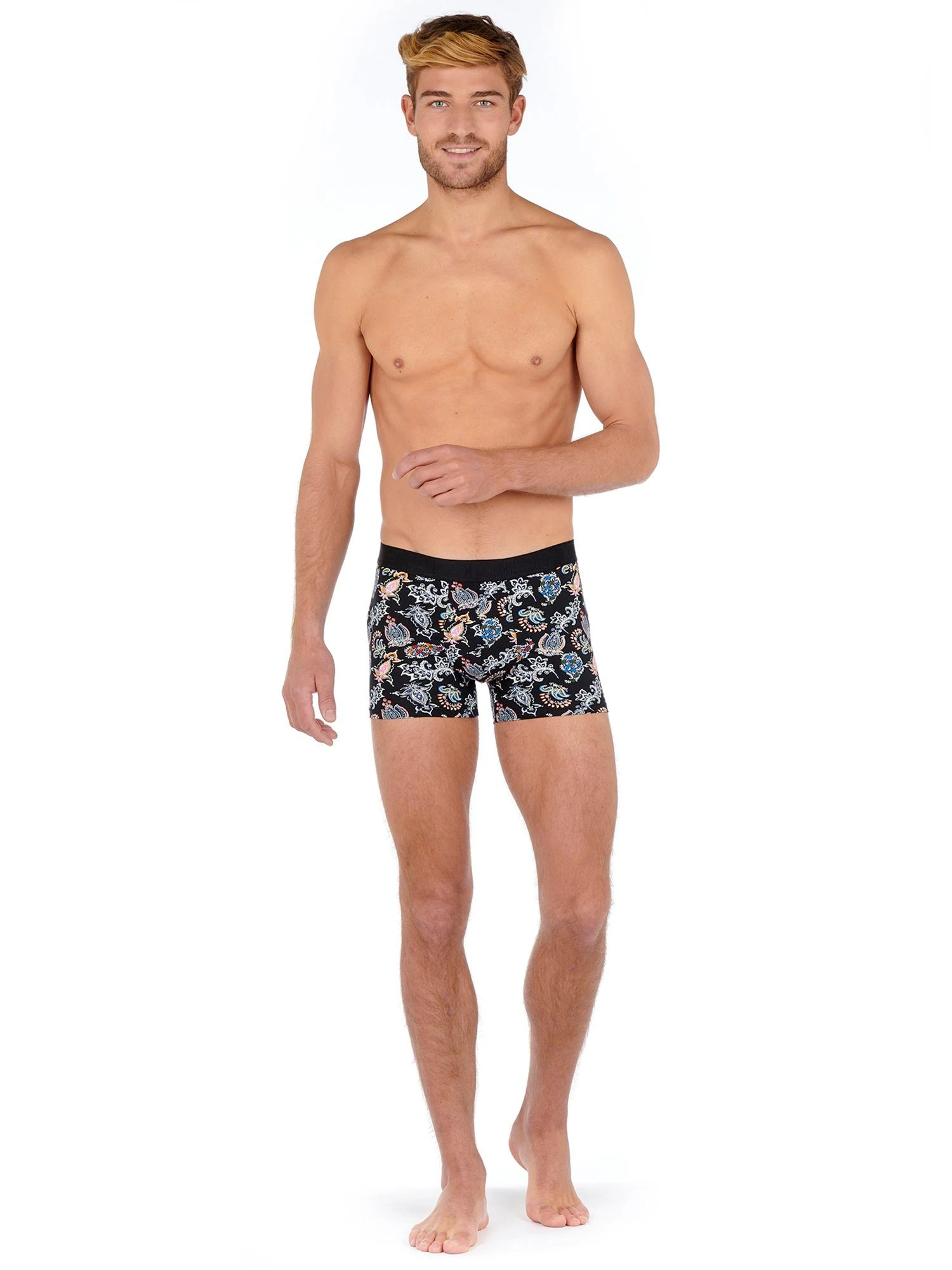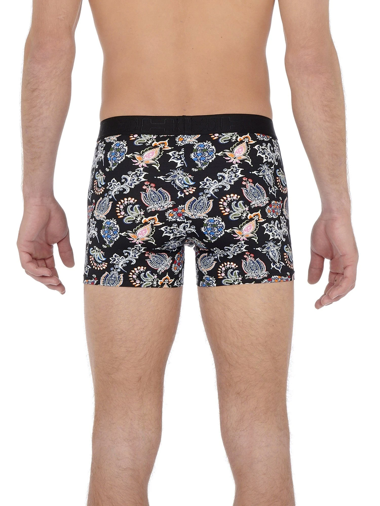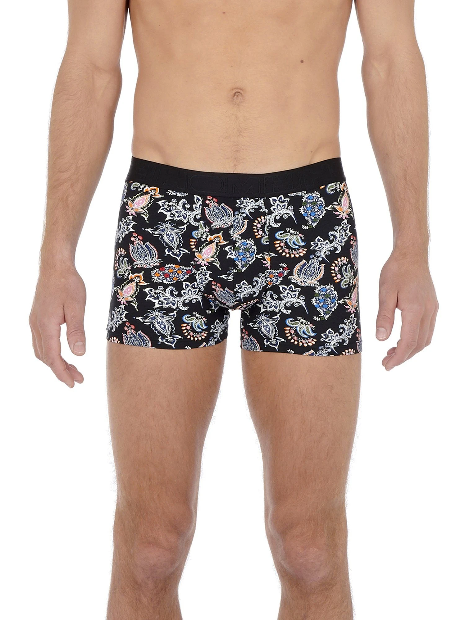 Der Boxershort EDDIE HOM für Herren ist ein klassischer Retroshort aus ultraweicher Modal-Baumwolle mit einem exotischen Vintage-Print aus mehrfarbigen Paisleymustern auf dunklem Hintergrund. Für einen besseren Halt wurde am Oberschenkel ein Stoffeinsatz in die Saumnaht am unteren Schaft eingesetzt. Das natürliche Modal-Baumwollmaterial von EDDIE sorgt für einen sehr weichen Griff und ist besonders für Herren geeignet, die Synthetik nicht mögen. Modal bietet außerdem optimale Absorptionseigenschaften und ist sehr resistent gegen Einlaufen und Abrieb. Der einfarbige elastische Bund dieser ist weich im Griff, angenehm auf der Haut zu tragen und mit einem subtilen Ton-in-Ton HOM Logo versehen.