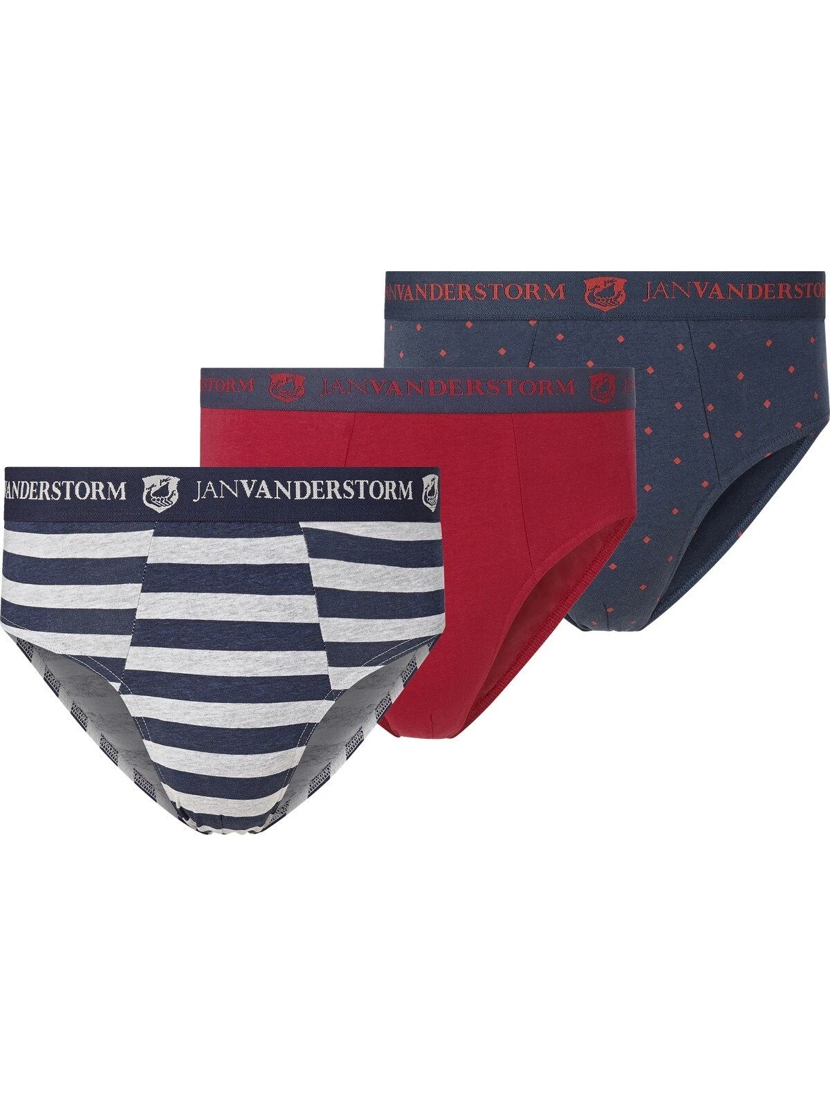 Der 3er-Pack Sportslip ALFINN ist perfekt für Männer, die wissen, was sie wollen: hochwertige Slips, die wie angegossen passen und dabei auch noch unverschämt gut aussehen. ALFINN schafft das mühelos, mit einem quer gestreiften, einem fein gepunkteten und einem unifarbenen Slip. Jeweils am Elastikbund: eingewebter JAN-VANDERSTORM-Schriftzug inklusive Wappen mit Wikingerschiff. Wenn Ihnen ALFINN gefällt, gefällt Ihnen bestimmt auch die Kollektion von JAN VANDERSTORM – entdecken Sie sie ganz leicht. Single Jersey aus 95 % Baumwolle, 5 % Elasthan. Maschinenwäsche.