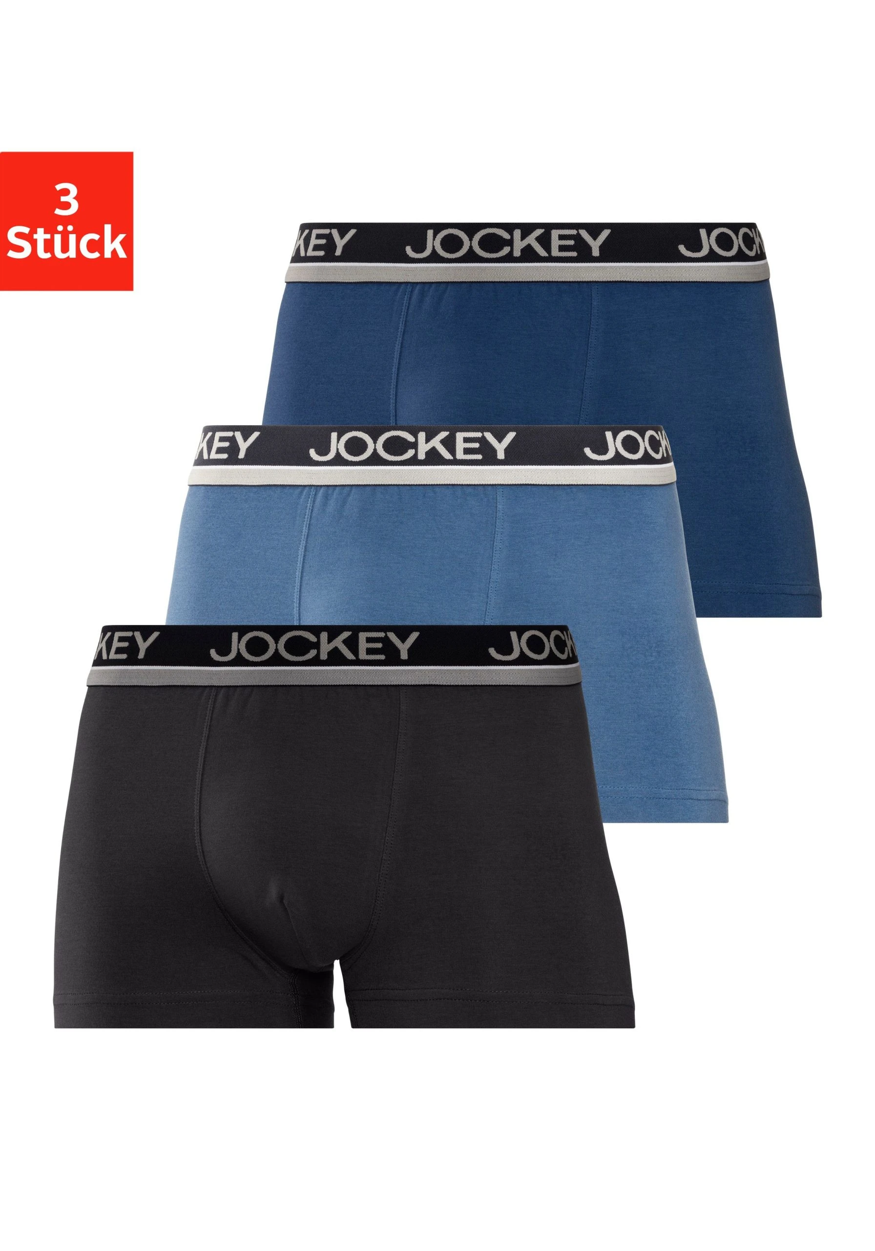 Jockey-Qualität gleich im 3er-Pack bekommen Herren mit diesem Set Boxer gereicht. Das maskuline Design mit aufgesetztem Logobund aus Webgummi und die körpernahe Passform machen die Trunks zu Must-have-Basics, die auf keinen Fall in deinem Wäschefach fehlen dürfen. Dank der weichen Qualität in Baumwollstretch-Ausführung sind die Unterhosen stets ein echter Tragegenuss. Gute Klassiker – was will man(n) mehr als den im besten Wortsinn soliden 3er-Pack Boxer aus dem Hause Jockey?
