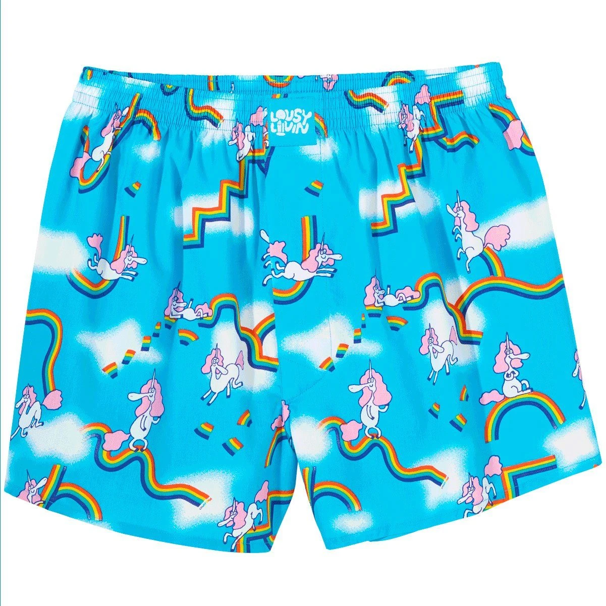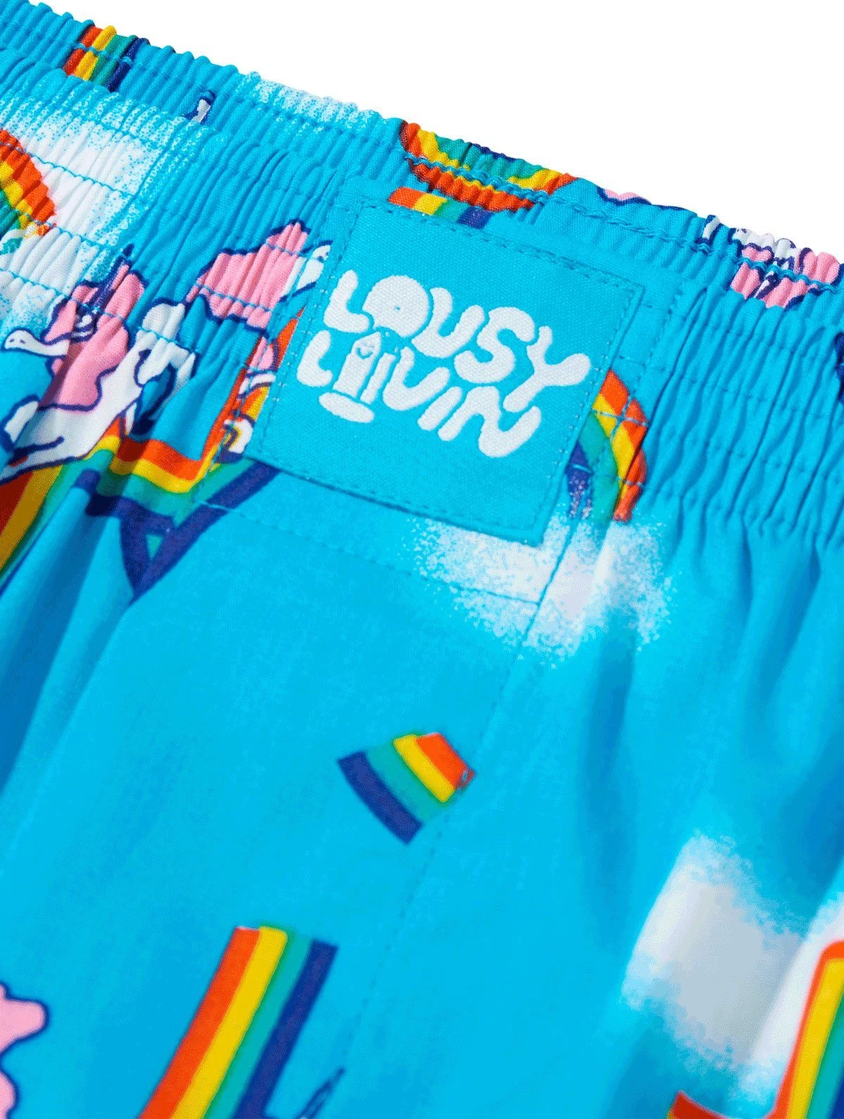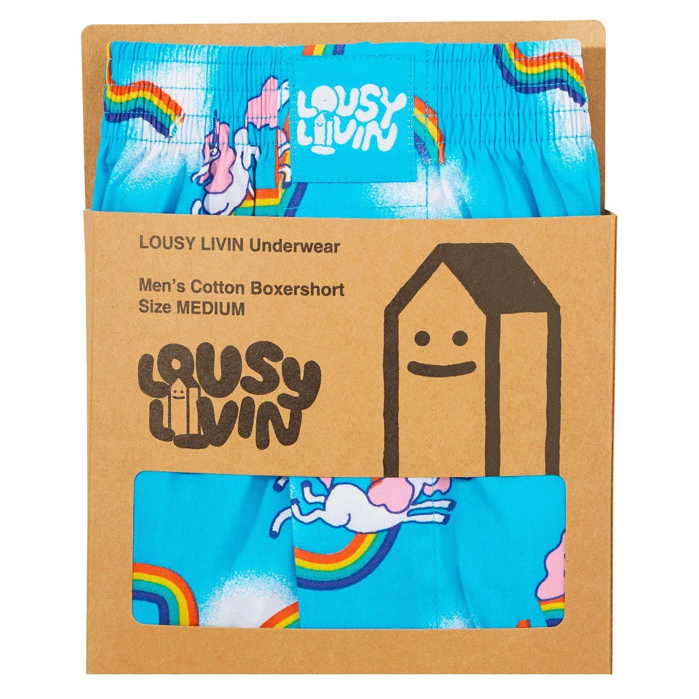 – blaue Boxershorts mit Einhörnern und Regenbögen – fühlbar angenehmer im Tragekomfort durch softes Carbon Finish – atmungsaktiv und hautsympathisch – elastischer Bund – weiter Beinabschluss für leichteres Tragen – klassischer Eingriff mit Knopf – gewebtes Lousy Livin Label aufgenäht vorne am Bund – 100% Bio-Baumwolle