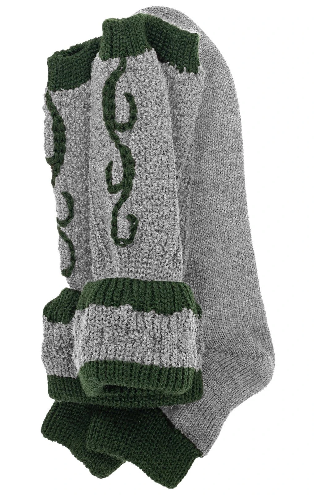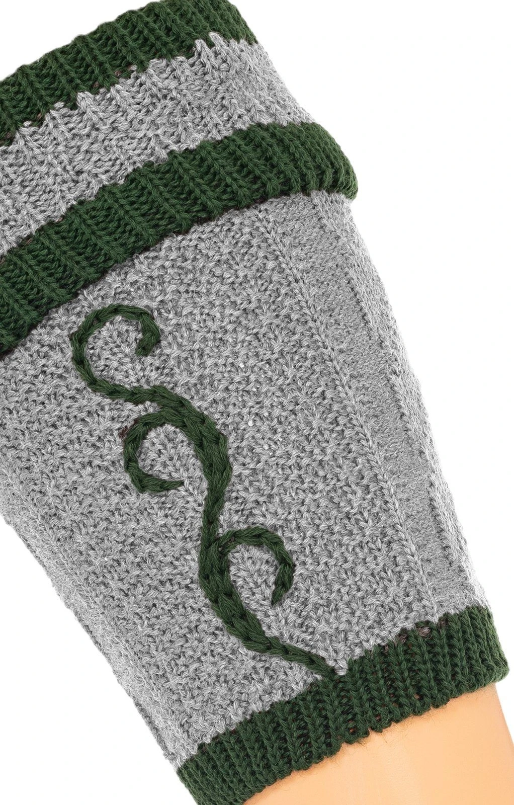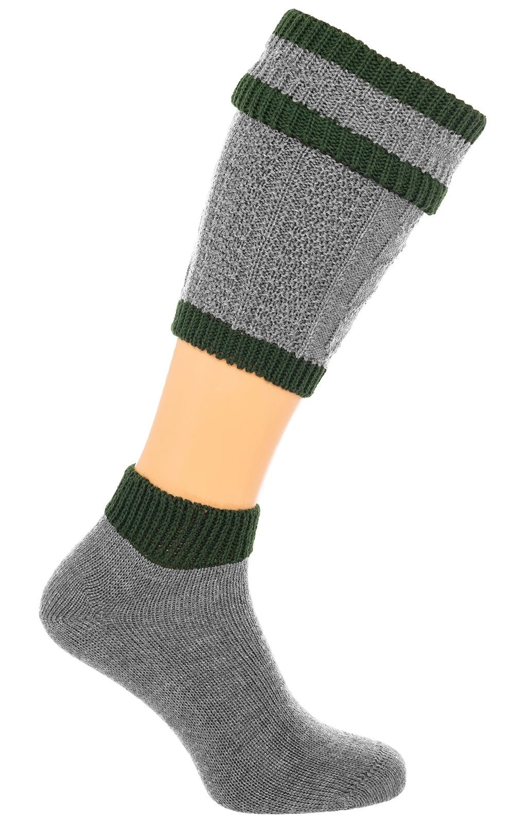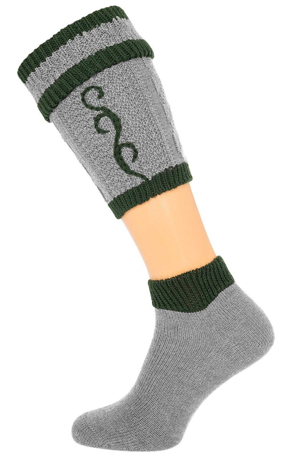 Traditionelle mittelgraue Loferl mit dekorativen Details in Tannengrün. Mit diesen grauen Loferln ergänzen Sie gekonnt Ihre Tracht. Die attraktiven Wadenstrümpfe sind in einem klassischen Strickmuster gearbeitet und mit schönen grünen Ranken verziert. Das stilvolle Paar Wadenstrümpfe besteht aus einem qualitativ überzeugenden Gemisch aus Merinowolle und pflegeleichtem Polyamid und darf deshalb bedenkenlos in den Schonwaschgang.