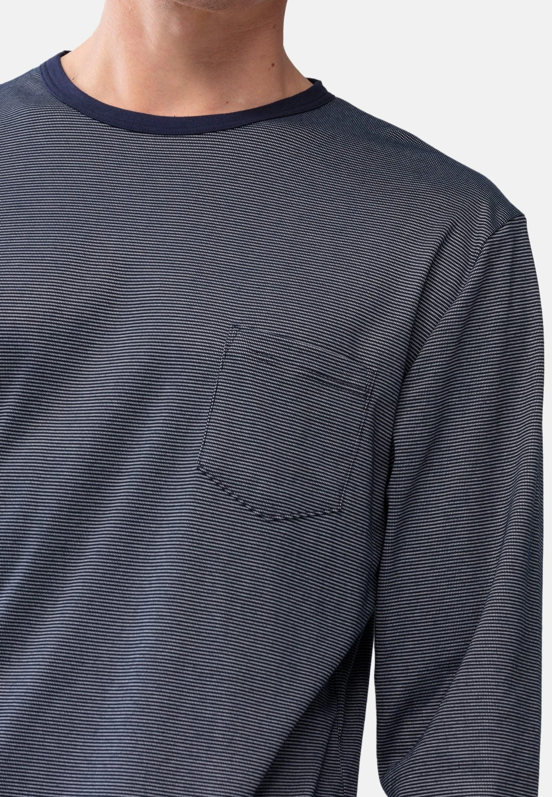 Langes Schlafanzug Set aus der Serie Bennison mit geringeltem Oberteil und einfarbiger Hose. Die legere Passform sorgt für einen lockeren Sitz und entspannte Nächte. Shirt mit praktischer Brusttasche und Rundhalsausschnitt. Hose mit elastischem Komfortbund. Aus weichem Jersey.