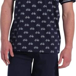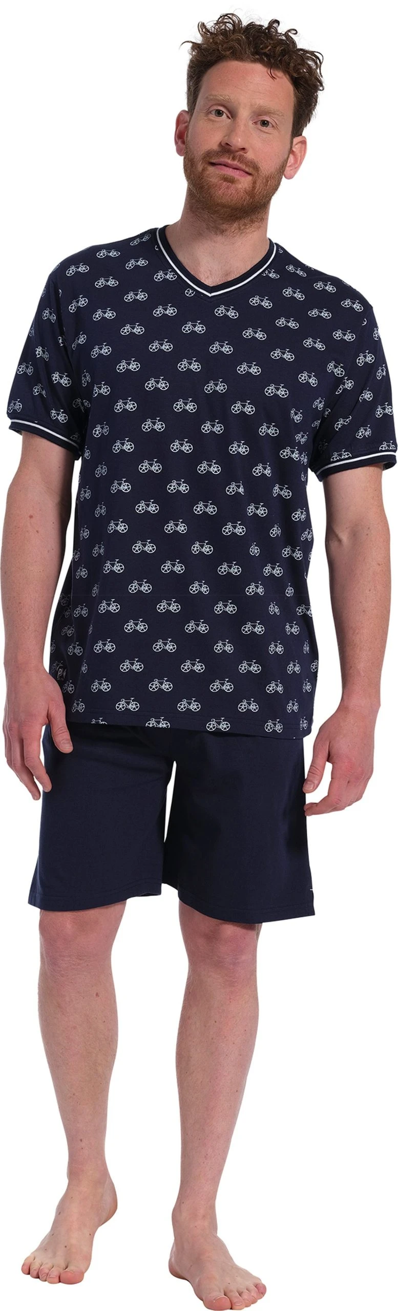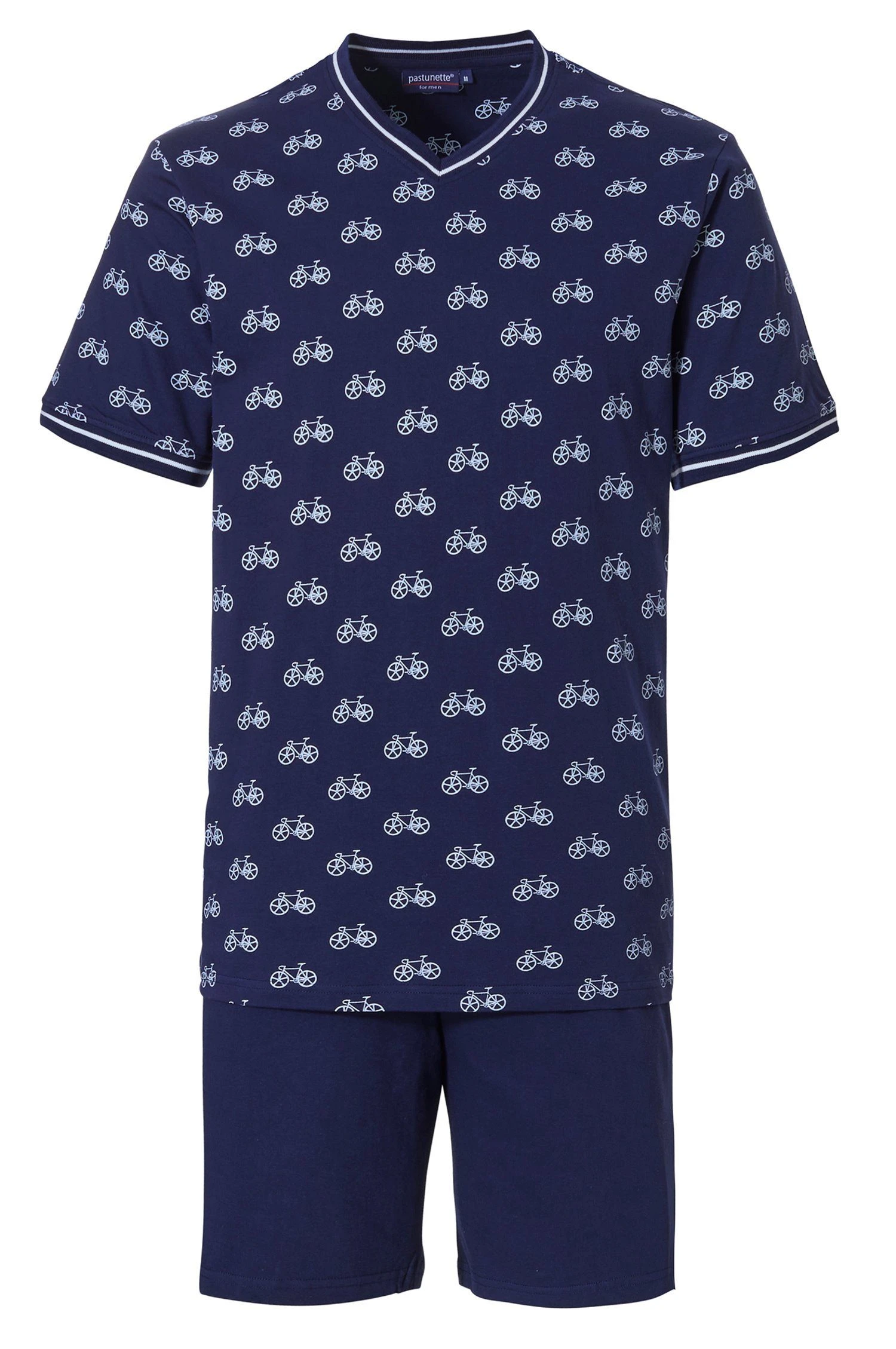 Pastunette Herren Shorty. Das Oberteil mit V Ausschnitt und kurzem Arm. Blauer Untergrund mit Fahrrädern allover. Die Unifarbene kurze Hose hat am Bund Gummizug.