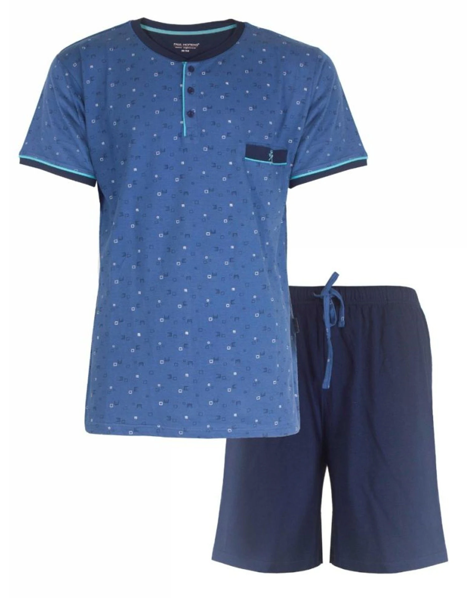 Paul Hopkins Herren Schlafanzug kurz. Das Oberteil ist mit kurzem Arm, Brusttasche, Rundhals Ausschnitt und Knopfleiste. Die kurze Hose hat einen Kordelzug.