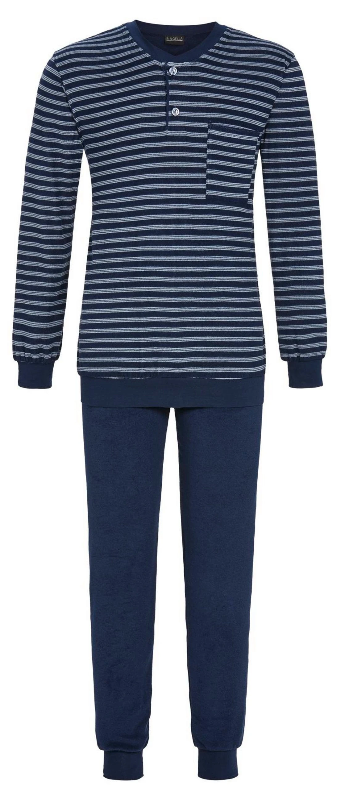Ringella Herren FRottee Schlafanzug. Ein trendiger, garngefärbter Ringel stellt das Pyjama-Oberteil gekonnt ins rechte Licht. Mit praktischen Strickbündchen am Hals, den Ärmeln, am Saum und als Beinabschluß. Die kleine Knopfleiste und die aufgesetzte Brusttasche sind einfach unverzichtbar. Der schöne Look wird durch die unifarbene Hose mit Gummizugbund unterstrichen. Hergestellt aus einem hochwertigem Baumwolle-Polyester-Mix in Stretchfrottee-Qualität ist ein enorm gutes Tragegefühl garantiert. Das Material sorgt für ein optimales Hautklima. Material: 80% Baumwolle, 20% Polyester