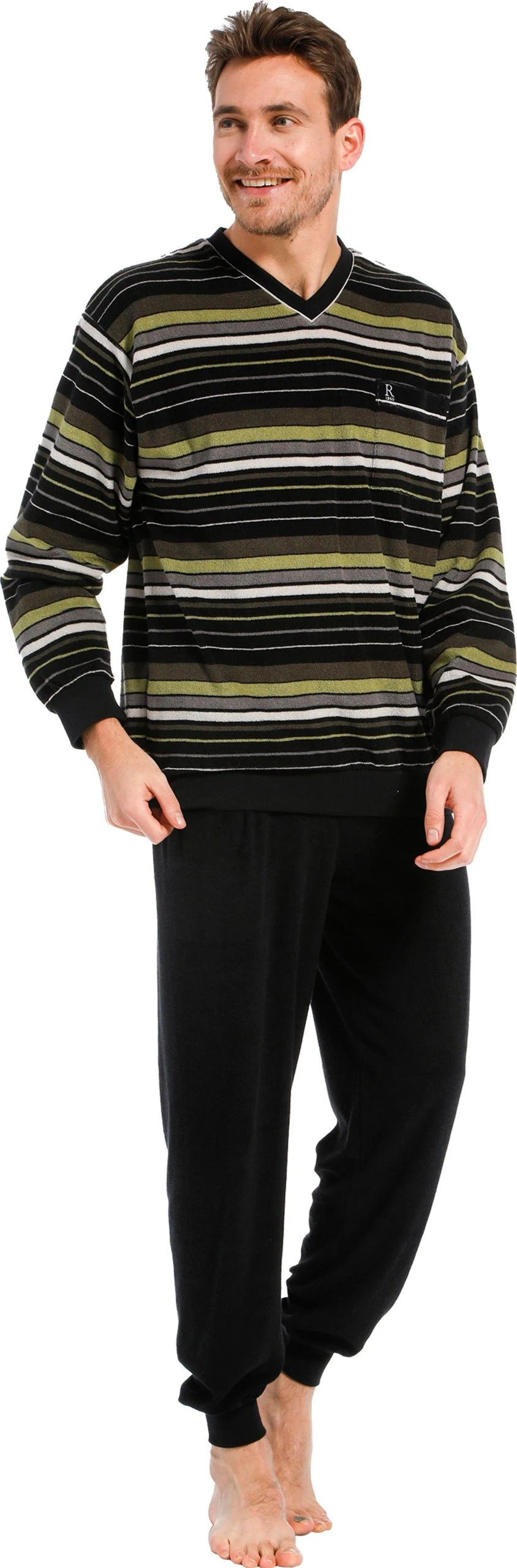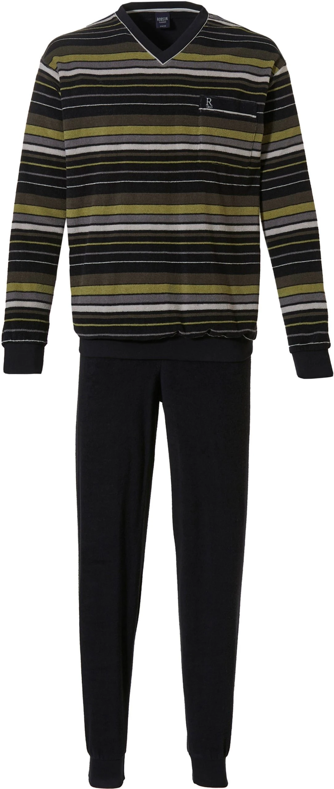 Robson Herren Frottee Schlafanzug. Material. 80 %Baumwolle, 20% Polyester. Das Oberteil ist gestreift mit einem V-Ausschnitt. Die Hose unifarben mit Gummizug