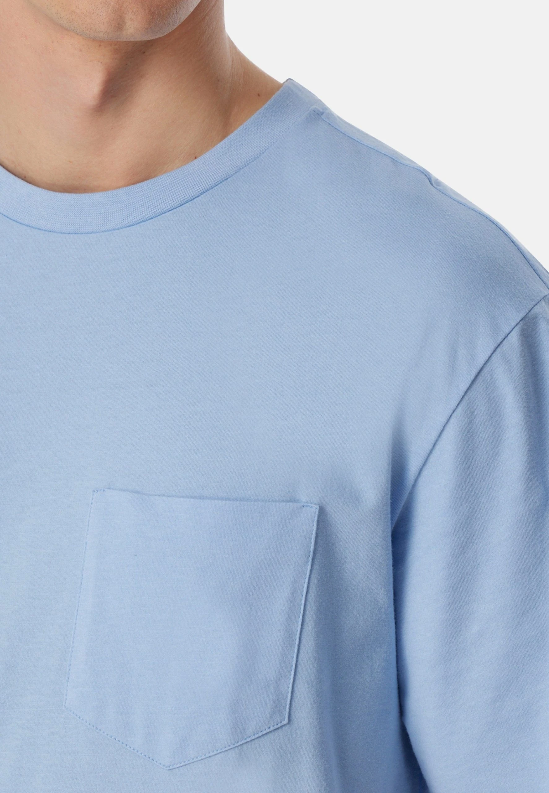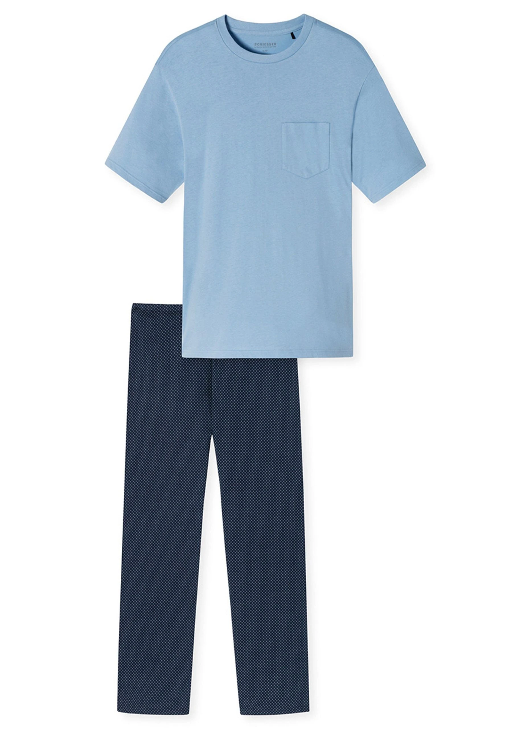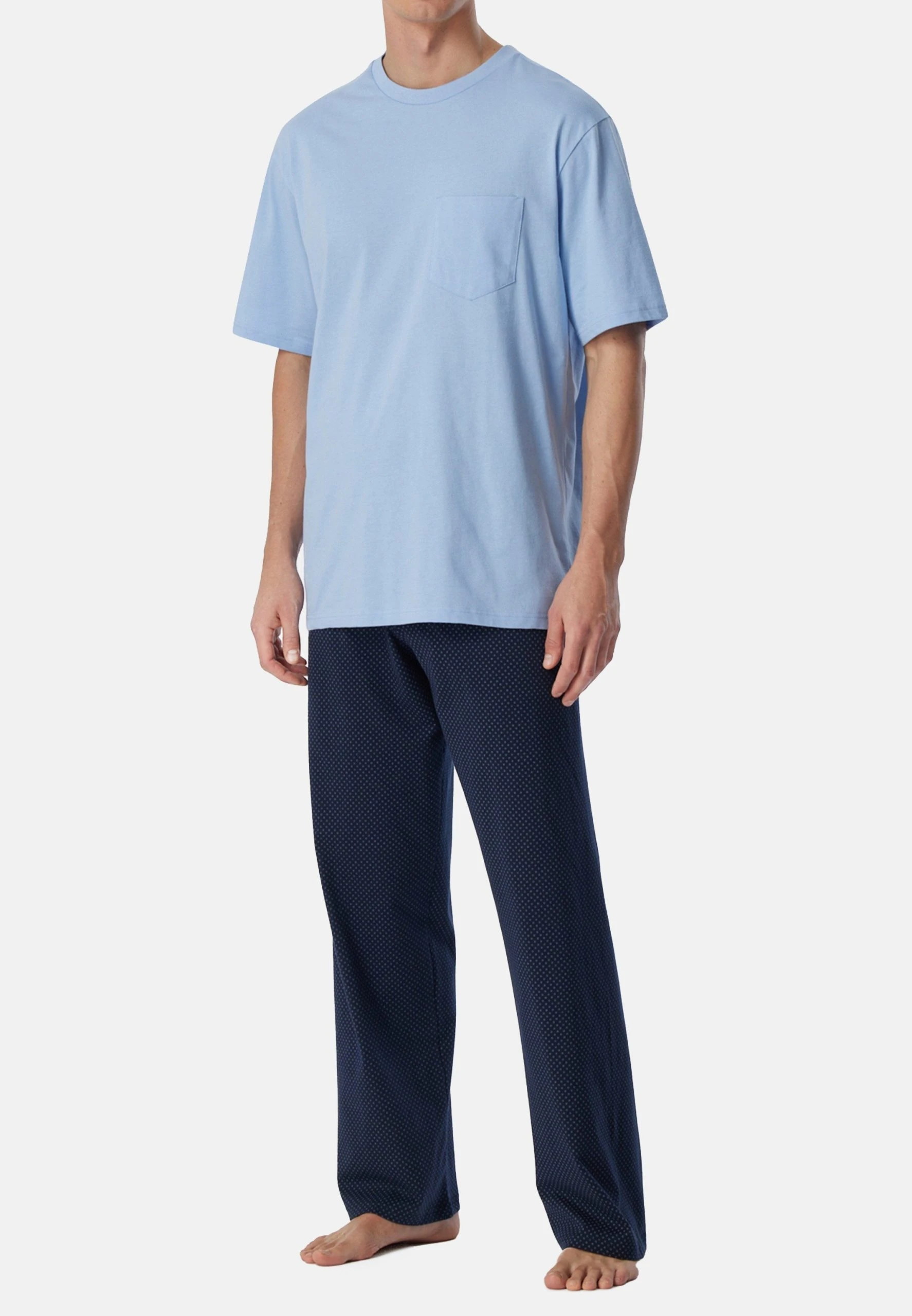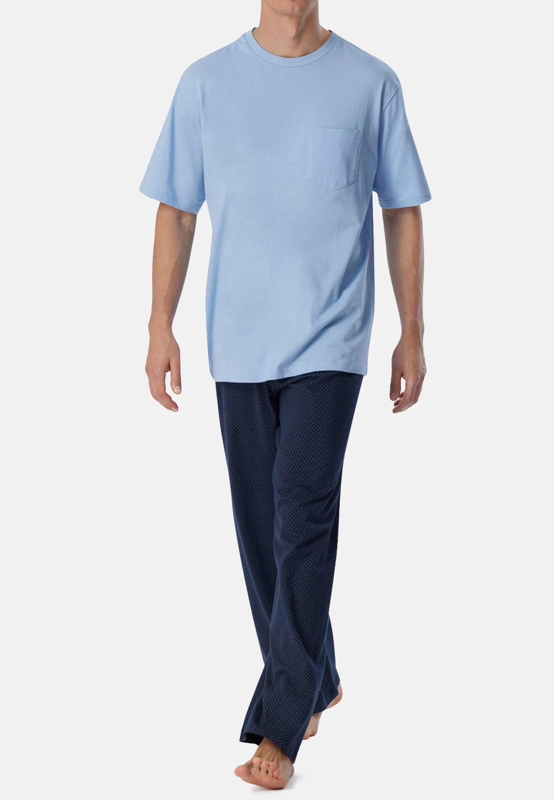 Im stilvollen Look und 100 % weicher Baumwolle überzeugt dieser Schlafanzug anspruchsvolle Herren. Das kurzärmelige, unifarbene Oberteil mit Rundhalsausschnitt und Brusttasche bekommt mit der langen Hose mit Kreismuster einen starken Partner. Locker leichter Single-Jersey übernimmt den komfortablen Part und verspricht angenehme Nächte in bester Qualität!