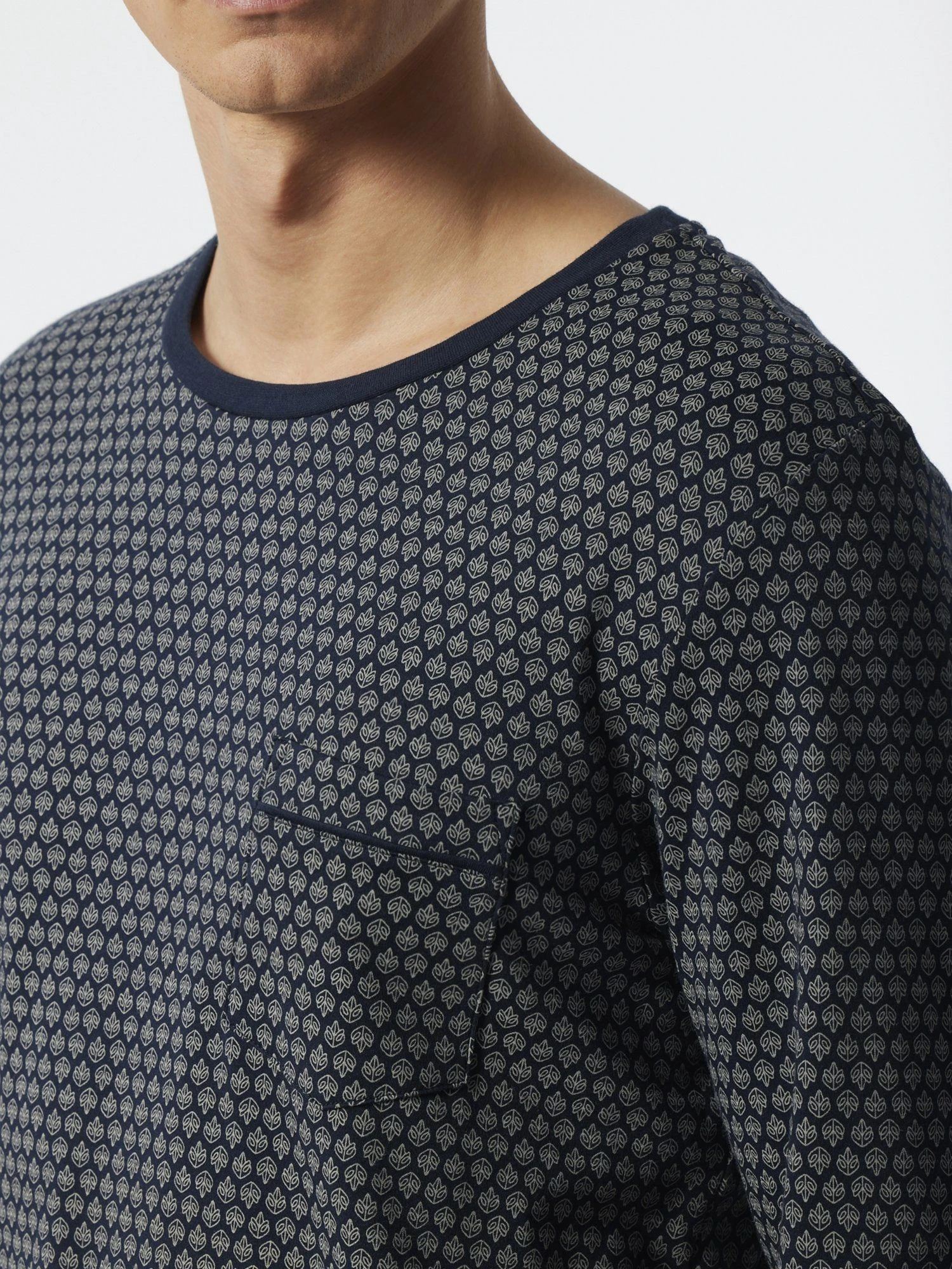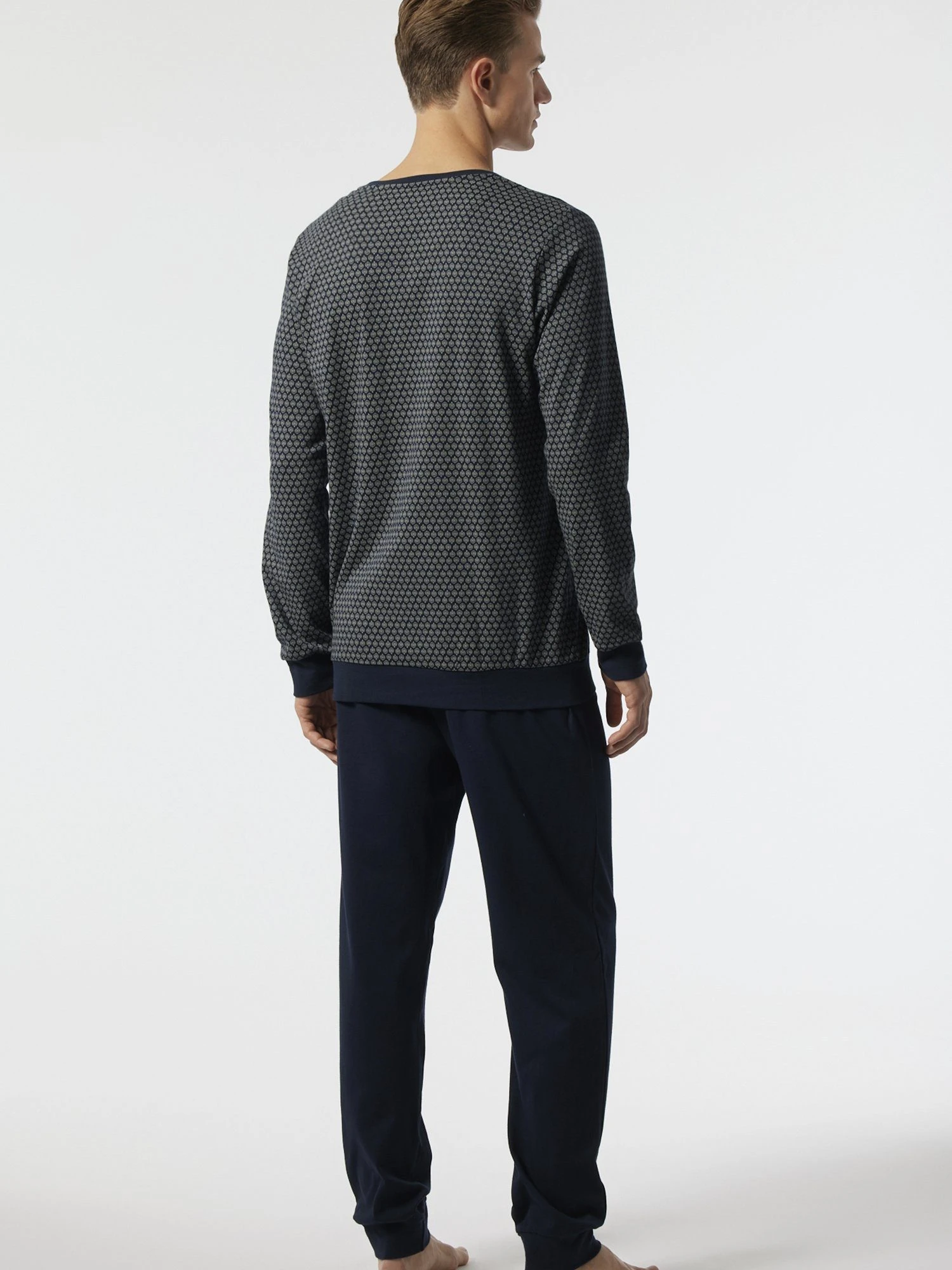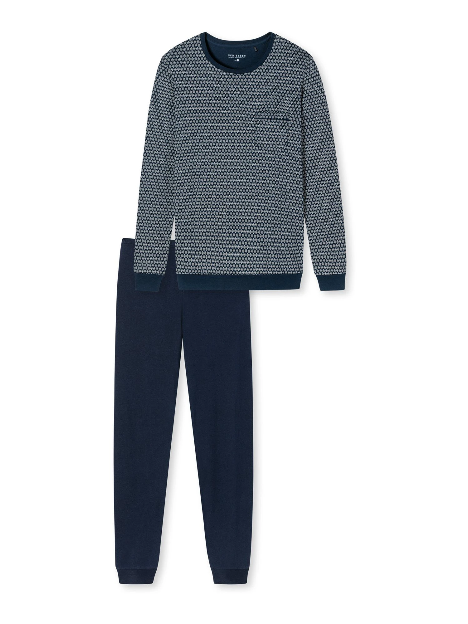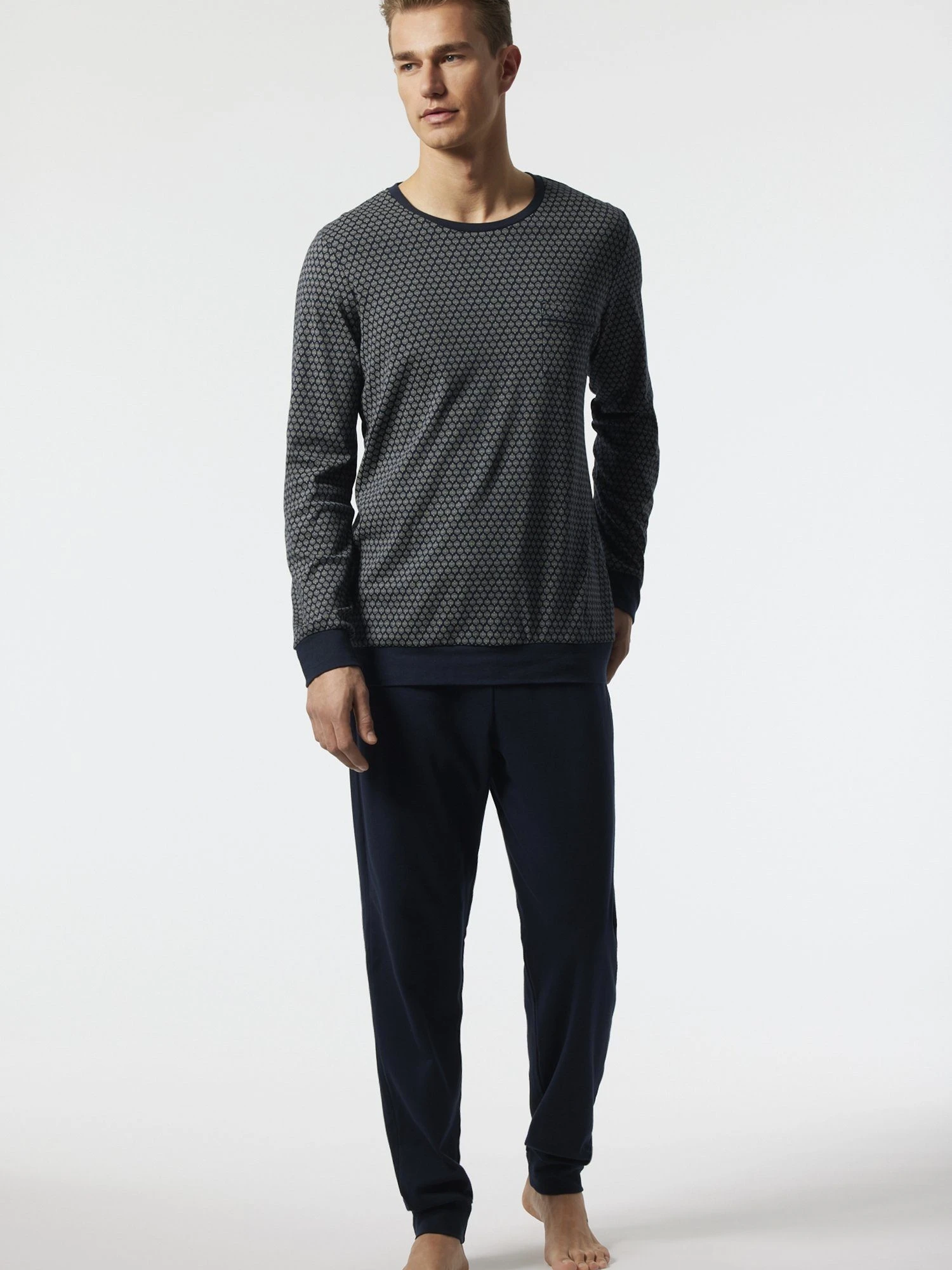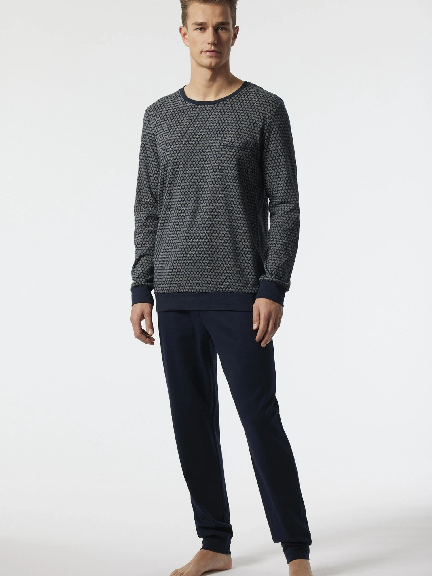 Sorgen Sie für Abwechslung in Ihrer Schlafroutine: Dieser lange Herrenschlafanzug aus Feininterlock mit 100% Baumwolle ist nicht nur besonders bequem, sondern durch den grafischen Minimal-Print auch ein echter Hingucker. Mit der aufgesetzten Brusttasche mit dunkelblauer Ziernaht und den unifarbenen Bündchen bekommt das gemusterte Rundhals-Shirt modische Details. Die farblich passende Hose mit Bündchen und praktischem Bindeband macht das Duo in bester SCHIESSER-Qualität komplett!
