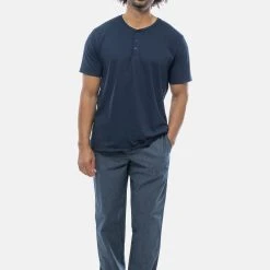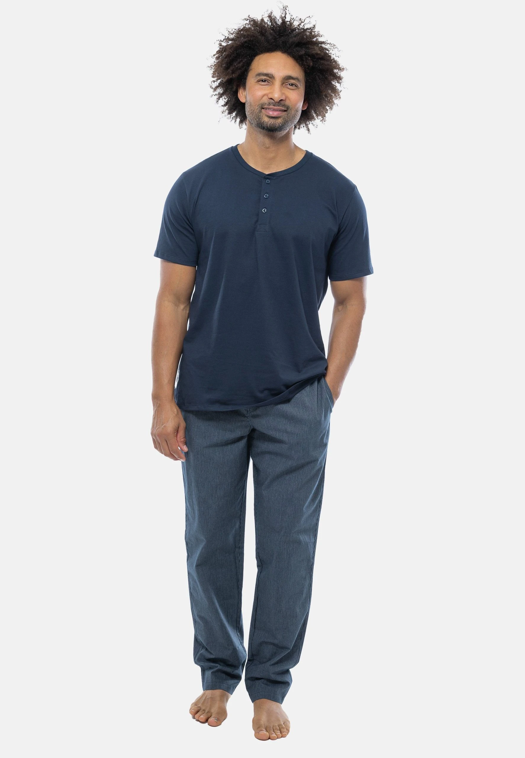 Ob zum Schlafen oder Entspannen, dieser zweiteilige Herrenschlafanzug sorgt, dank des natürlichen Materials aus reiner Baumwolle, immer für ein angenehmes Tragegefühl. Das T-Shirt im Henley-Stil mit Knopfleiste wird durch die lange Hose aus Webstoff stilvoll ergänzt. Ein unverzichtbares Relax-Set für qualitätsbewusste Männer!