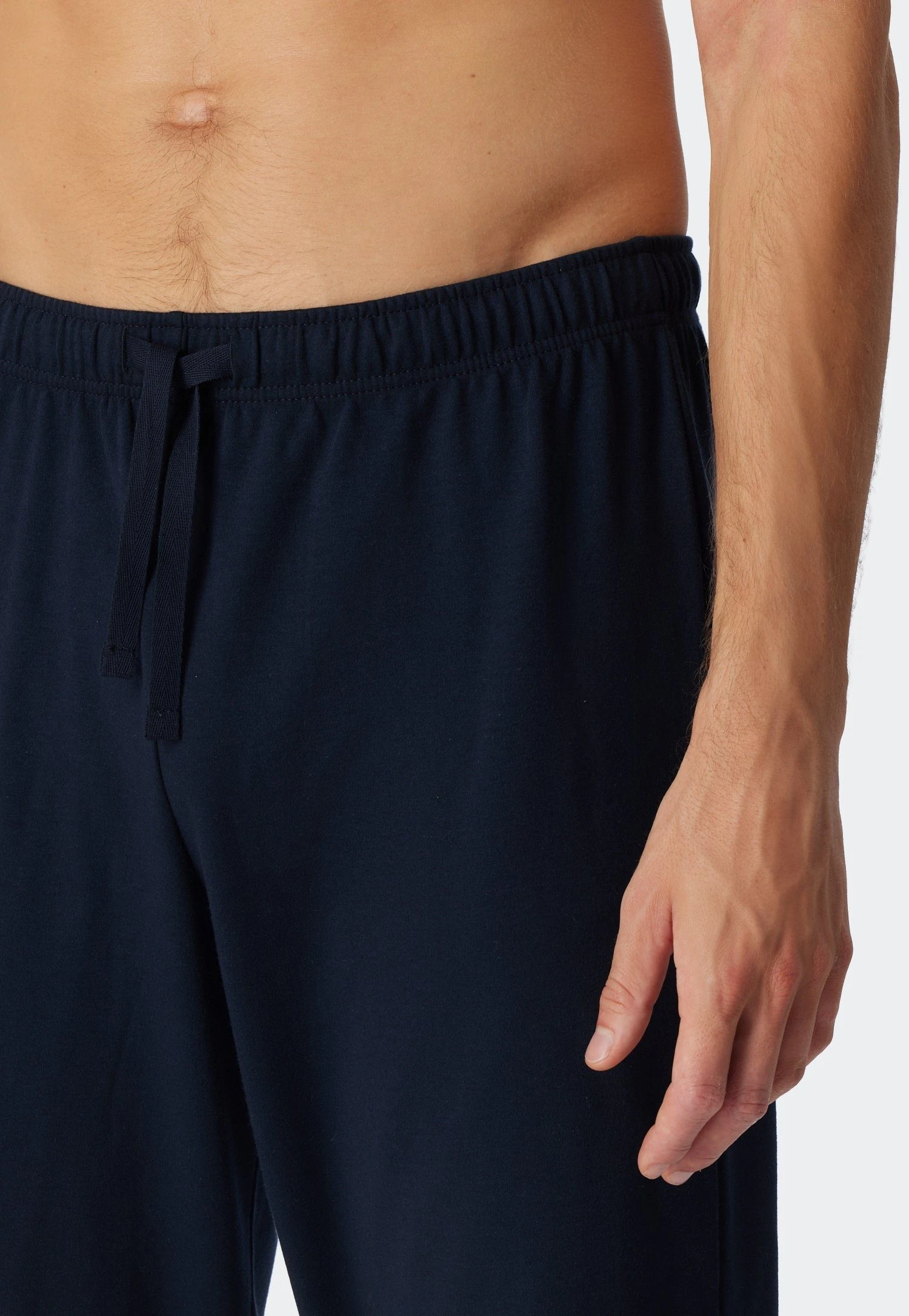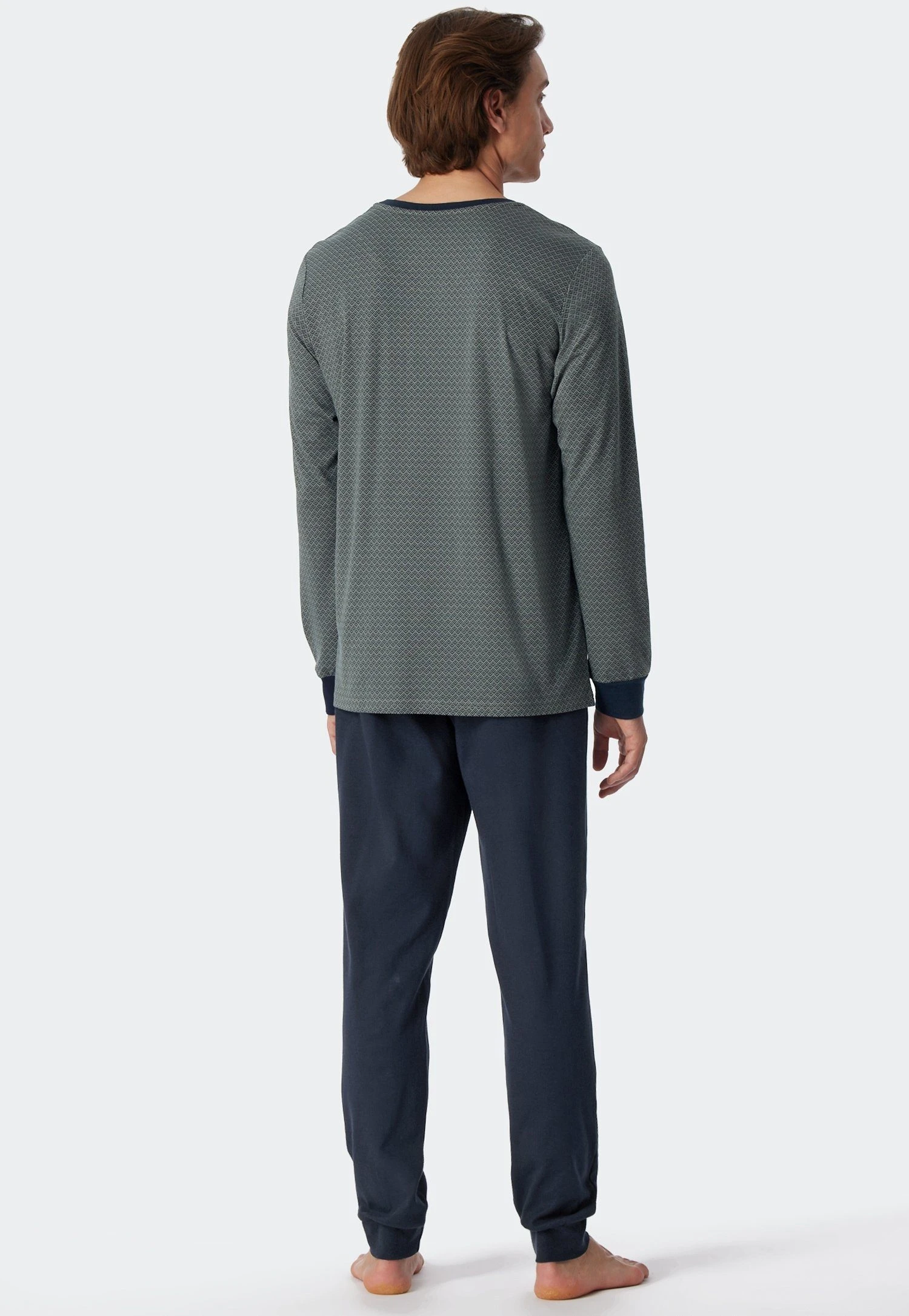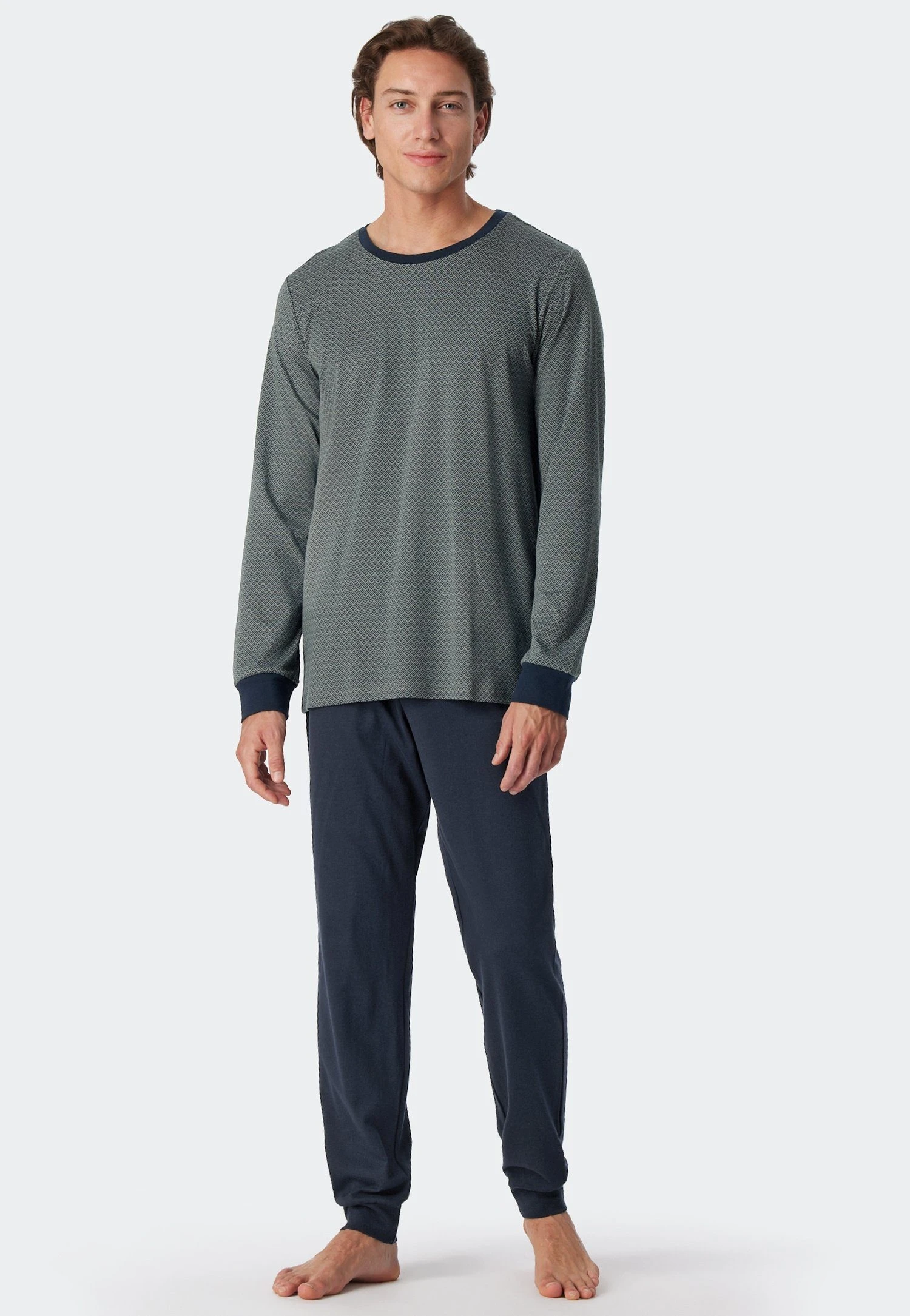 Hoher Tragekomfort steht ganz im Fokus dieses langen Herren-Schlafanzugs. Weiche Interlock-Qualität aus 100 % Baumwolle fühlt sich dabei besonders angenehm an und wird mit den dunkelblauen Bündchenabschlüssen stimmig abgerundet. Auch optisch kann der Zweiteiler mit schlanker Schnittform punkten: Ein graugrünes Minimalmuster schenkt dem dunkelblauen Langarmshirt mit tonalem Rundhalsausschnitt pure Eleganz. Fehlen nur noch die dunkelblaue Schlafhose und beste SCHIESSER-Qualität!