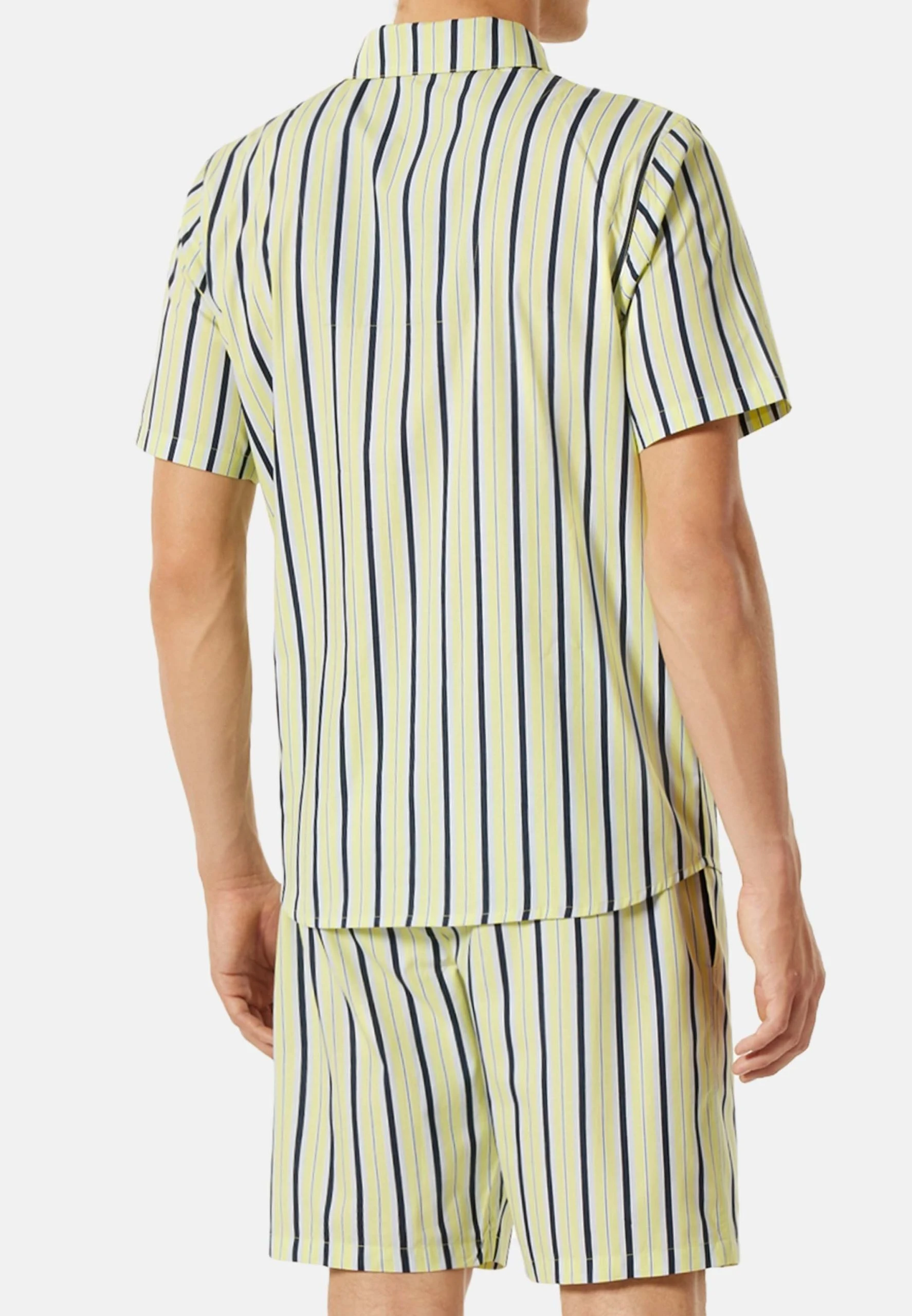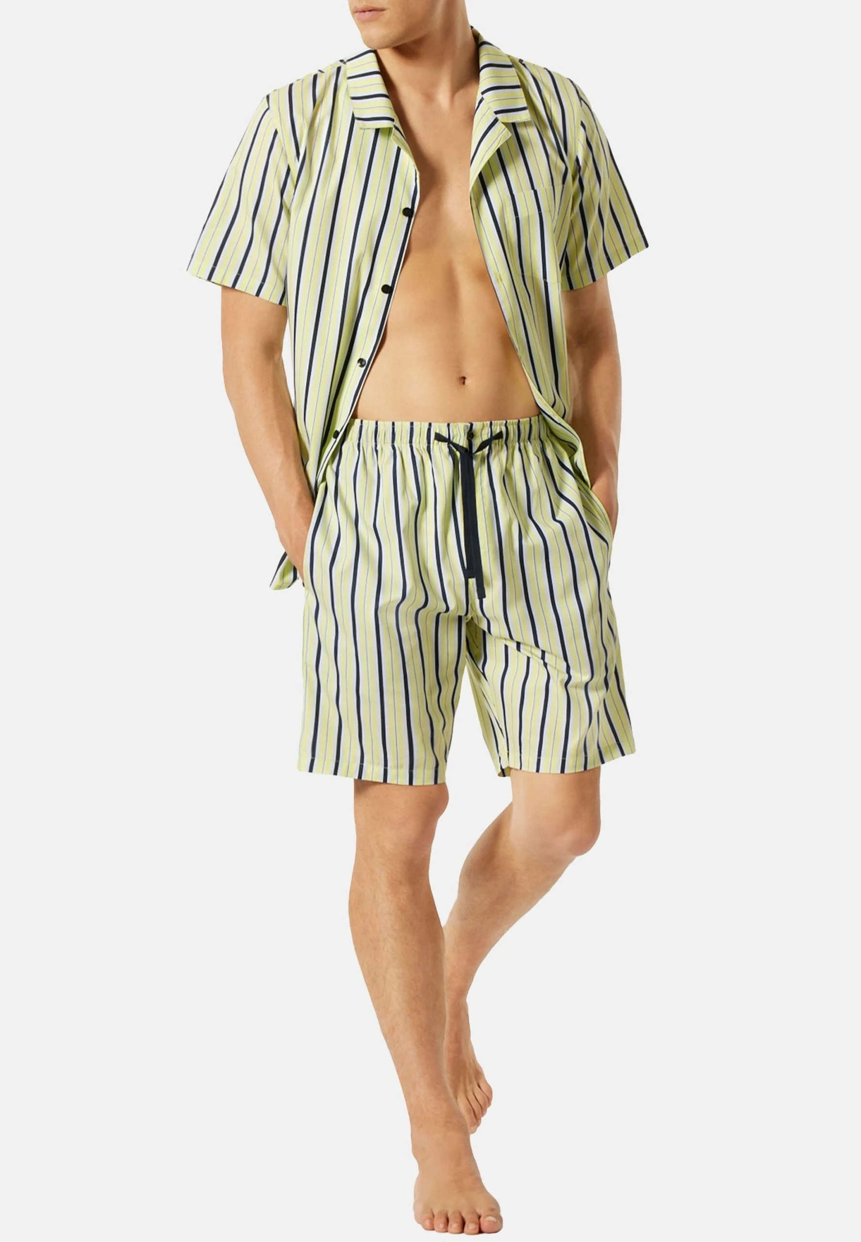 Modische Streifen kombiniert mit höchstem Tragekofmort: Dieser kurze Herren-Pyjama ist stilvoll, maskulin und bequem. Dank weicher Webware aus 100 % Baumwolle ist der Zweiteiler besonders angenehm zu tragen. Passende Details sind der klassische Kragen, die Knopfleisteund die aufgesetzte Brusttasche. Die ebenfalls gemusterte Hose ist mit ihren seitlichen Taschen eine perfekte Ergänzung. Genau das richtige Duo für entspannte Nächte in bester Qualität!