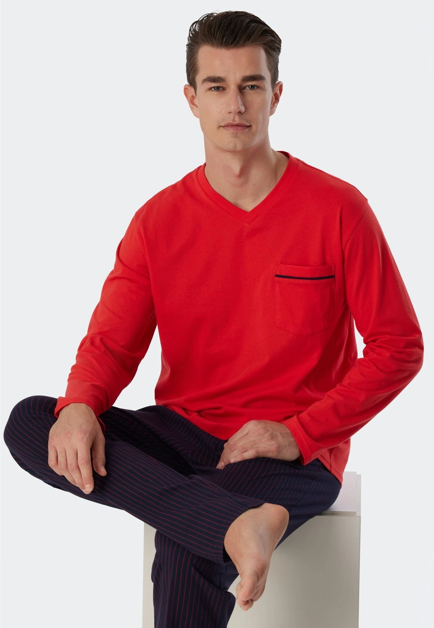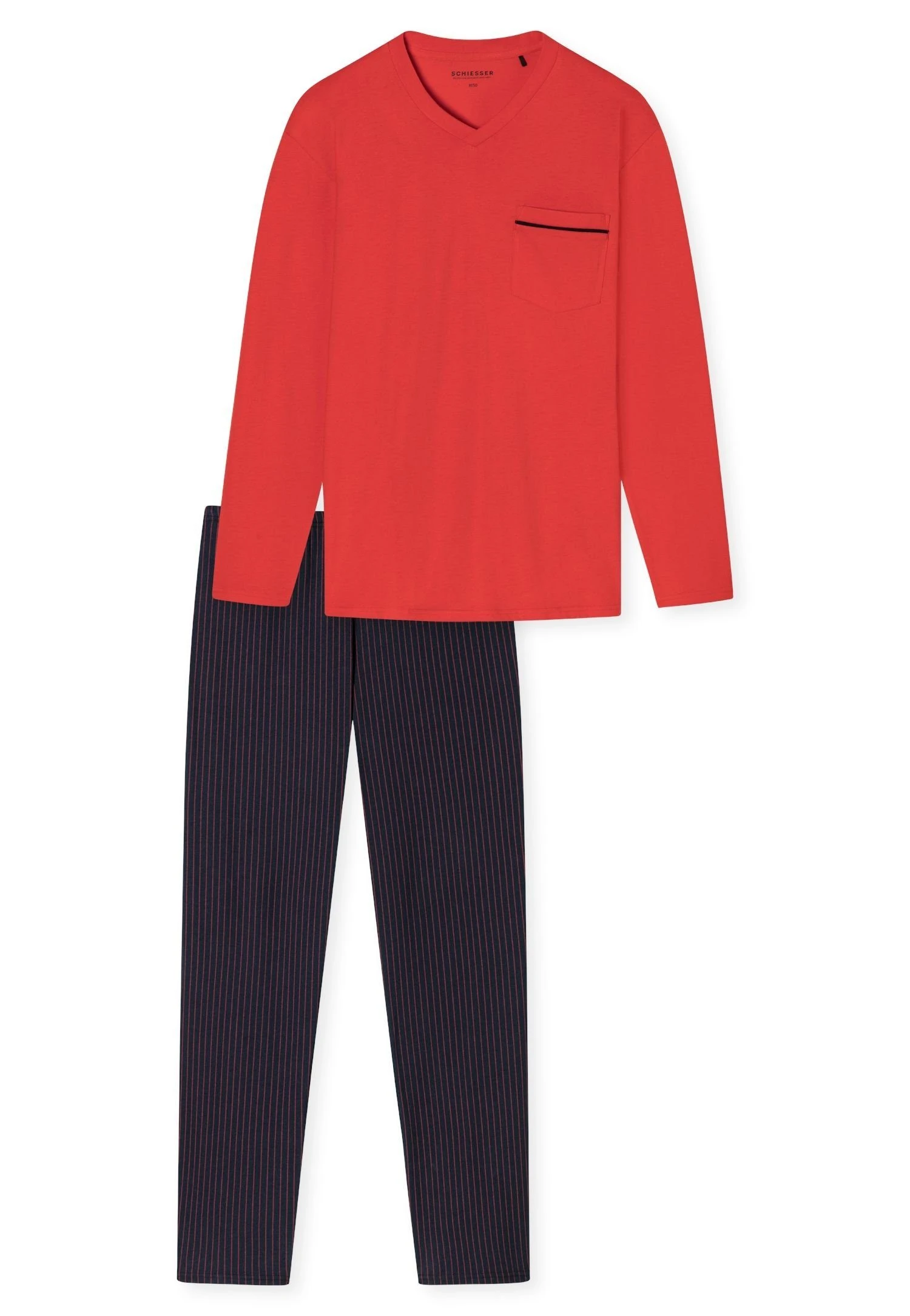 Freuen Sie sich auf einen Herren-Schlafanzug im modischen Design und in softer Single-Jersey-Qualität. Dieser lange Zweiteiler aus 100 % Baumwolle ist ein echter Hingucker und überzeugt mit höchstem Tragekomfort. Mit der aufgesetzten Brusttasche und V-Ausschnitt bekommt das unifarbene Langarmshirt topaktuelle Details. Die gestreifte Hose und der bequeme Bund machen das lässige Nachtwäsche-Duo in bester SCHIESSER-Qualität komplett! Auch in speziellen sowie großen Größen erhältlich.