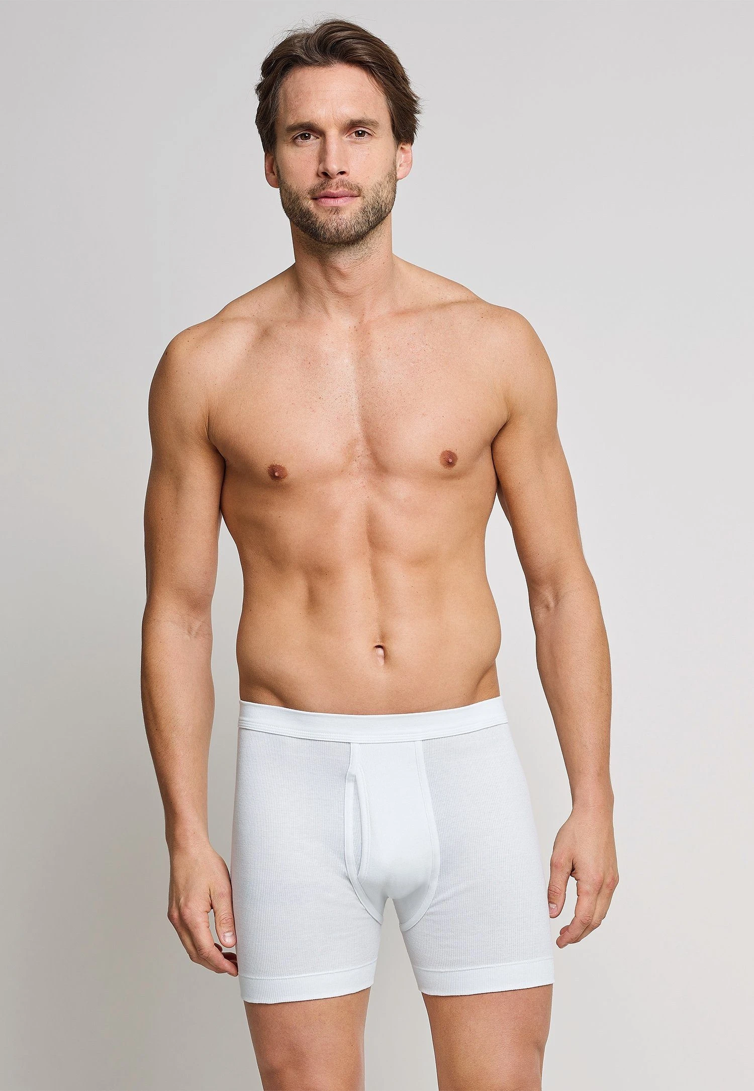 Klassische Tagwäsche mit Komfort: Diese weiße, kurze Herrenunterhose überzeugt durch ein besonders langlebiges, strapazierfähiges Material und einen maskulinen Charakter. 100% supergekämmte Baumwolle in Doppelripp-Qualität und der Softbund fühlen sich dabei angenehm weich an auf der Haut und bleiben auch nach der 95-Grad-Wäsche in Topform. Die ideale Tagwäsche für Herren, die höchsten Tragekomfort in gewohnt bester SCHIESSER-Qualität schätzen.
