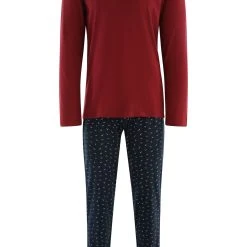 Bequemer Schlafanzug bestehend aus einem einfarbigen Shirt mit langen Ärmeln und einer dezent gemusterten Hose. Das natürliche Material aus 100% Baumwolle ist hautsympathisch und angenehm weich.